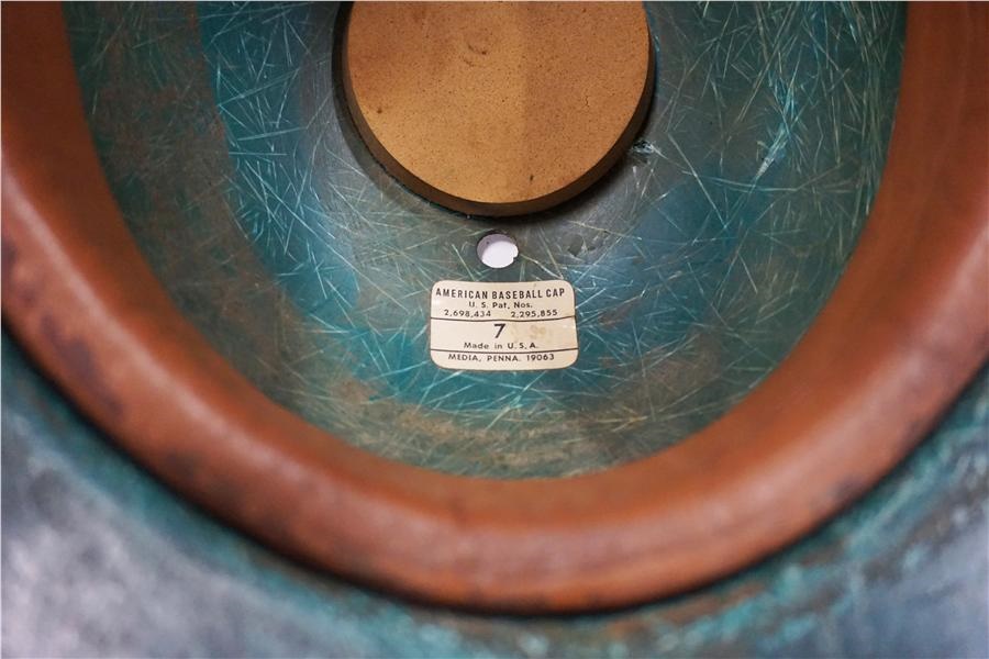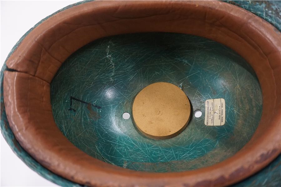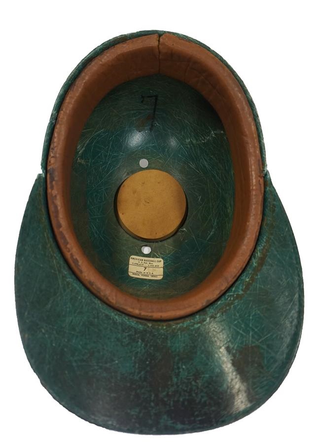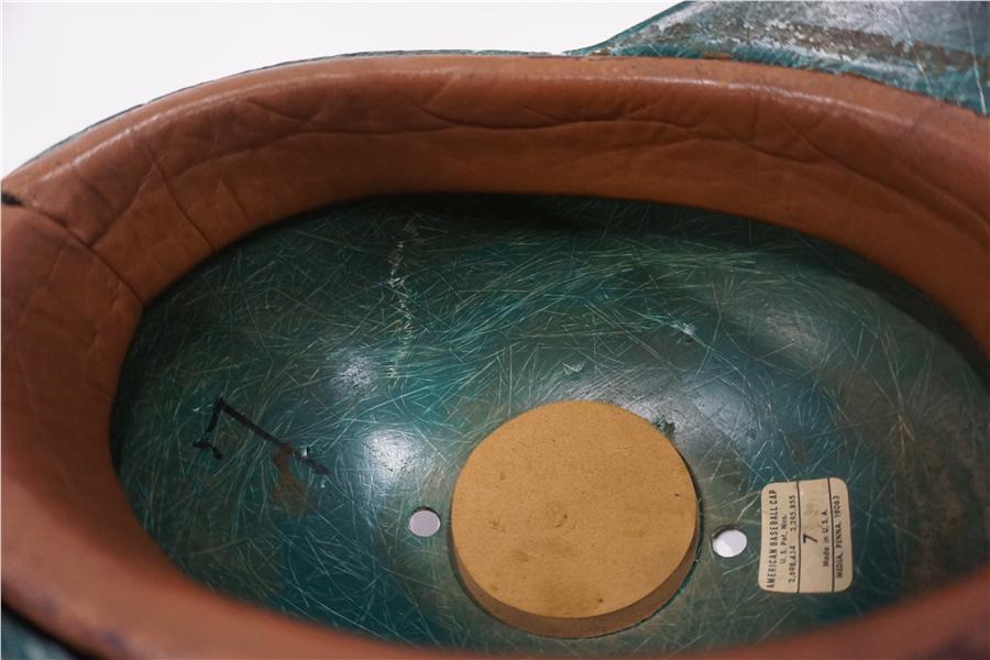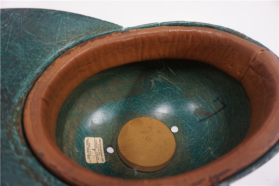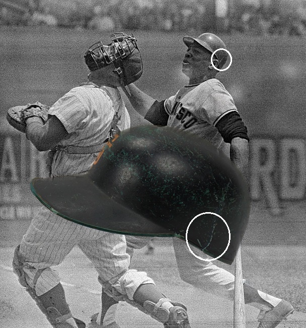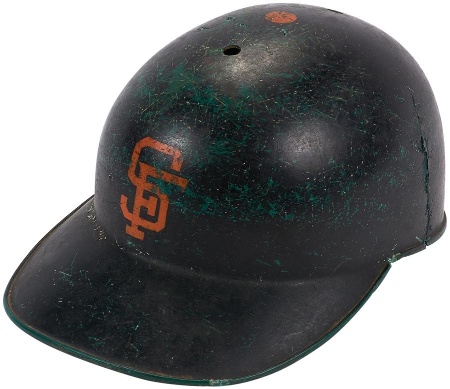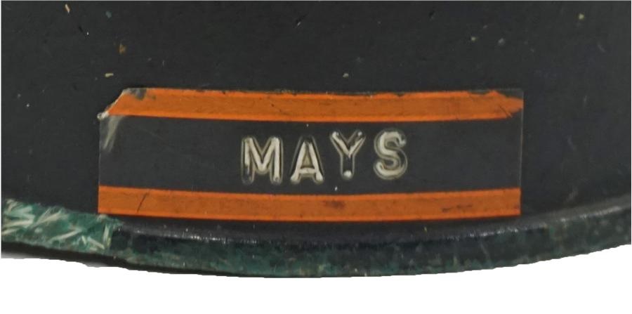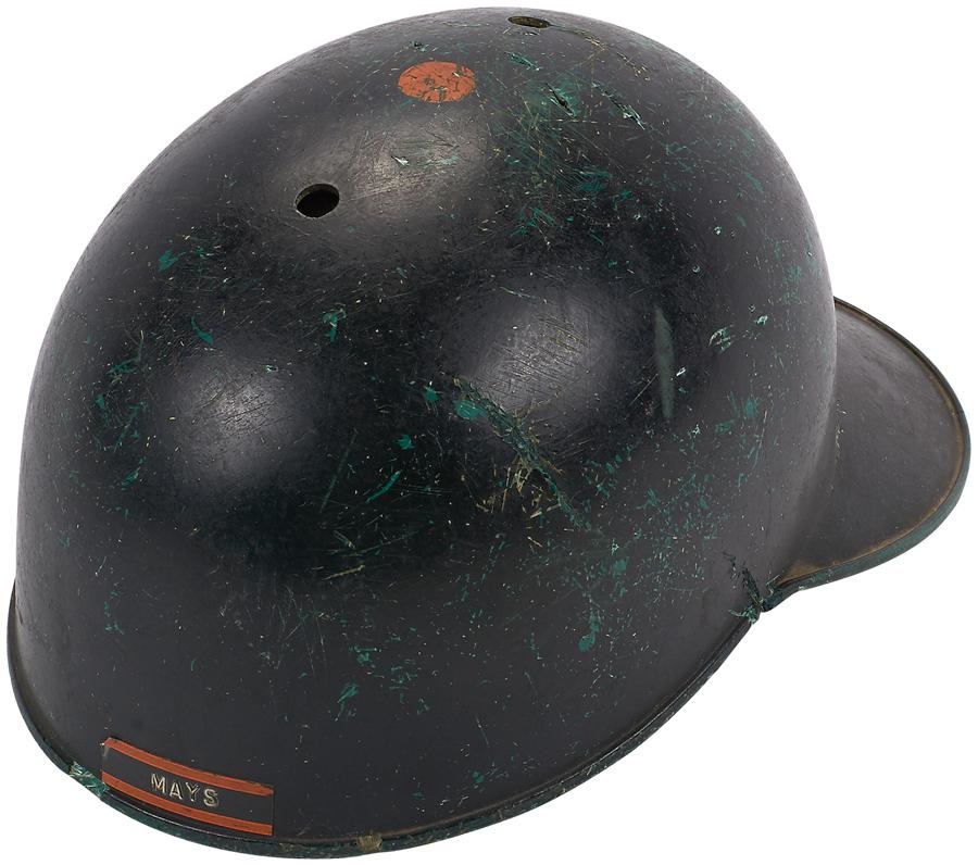 Perfectly photo-matched artifact bursts with history. Worn by Willie Mays in 1962, a photo from that days game shows a white line imperfection in the helmet better than a fingerprint. Black with green molded fiberglass peeking through the many areas of wear over a season or more of use, it bears the interlocking "SF" logo stenciled on the front in orange paint. Vintage dymo tape on the back of the helmet has "MAYS" in white letters and there is an American Baseball Cap size 7 sticker inside along with "7" also written in marker. Original padding inside the rim is all there and this lid shows great use with a few large cracks that in no way take away from its overall appeal, which can't be overstated. As shown in the listing photo, we have found an exact photomatch for this helmet pinpointing to 1962 game versus the New York Mets. Catcher Hobie Landrith only caught two games against the Giants in 1962 and Mays hit home runs in both, making this a definite home run helmet.