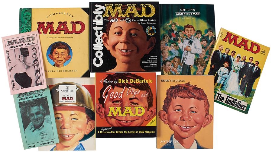 Don't get mad - check out this group of stuff from Josh Evans' personal collection: 1) 1991 1st Edition of "Completely MAD" signed by Bill Gaines ("For what's his name, Enjoy! MAD-ly Bill Gaines") and by the author Maria Reidelbach. With dj, sigs obtained in person at NYC signing. 2-3) Two issues of 1981 fanzine MAD Freaks USA (#3 & 6). 4-5) Two "Collectibly MAD" by Grant Geissman (1995), hardcover 1st Edition & paperback (2). 6) "A Memoir by Dick DeBartolo Good Days & MAD" 1994 1st Edition with dj. 7-10) Four auction catalogues from the MAD archives: two 1995 & one 1998 Sotheby's, and 1992 Christie's East w/bidding paddle & prices realized. 11) MAD magazine #155, 1972 Godfather cover.