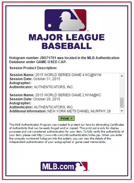 Lot # 479: Historic 2015 World Series & Postseason Daniel Murphy Game Worn Cap (MLB Auth.)