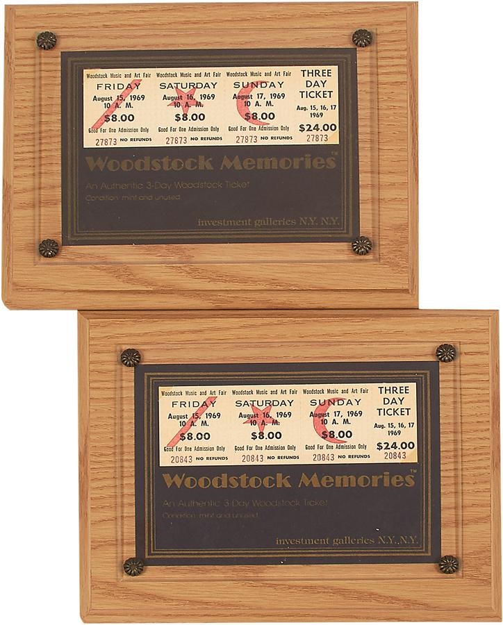 Both in plaques measuring 8x10" each, this lot consists of two (2) unused Woodstock three-day tickets. Beneath each ticket is a plaque which reads, "Woodstock Memories, An Authentic 3-Day Woodstock Ticket, Condition mint and unused." All days are $8.00 per day. Those three days of peace, love, and music remain a cultural mile-marker in American history.