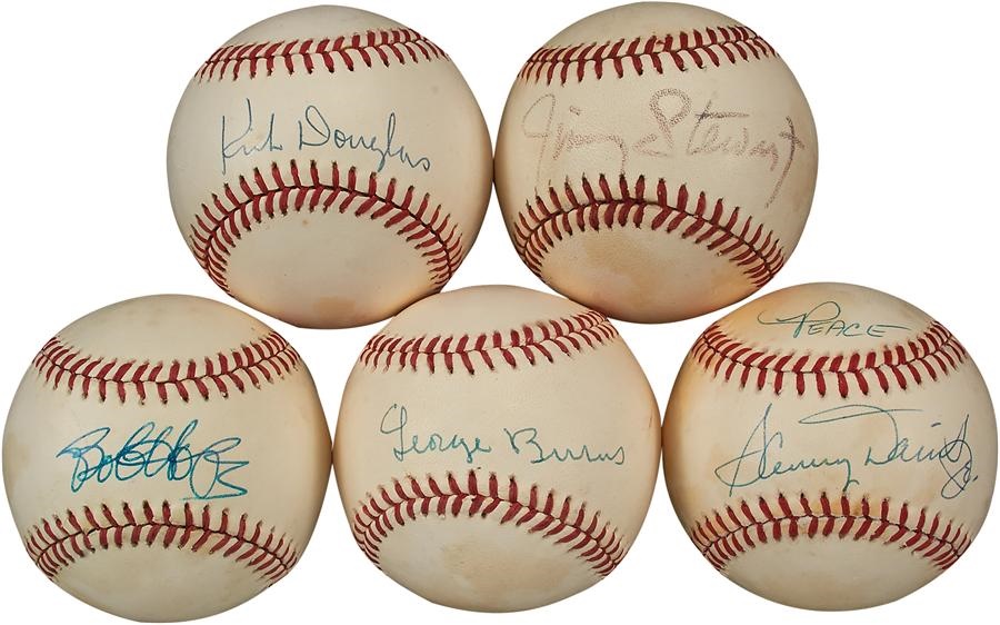 This is a great mixed-medium set, as stars of American stage and screen have autographed the very symbol of America's pastime. These five celebrity baseballs are all autographed on either official National or American League baseballs, and signers include: Kirk Douglas, Bob Hope, Jimmy Stewart, George Burns, and Sammy Davis Jr "Peace." The signatures are in various condition, with Stewart's showing the most fading, and the average about 7/10.