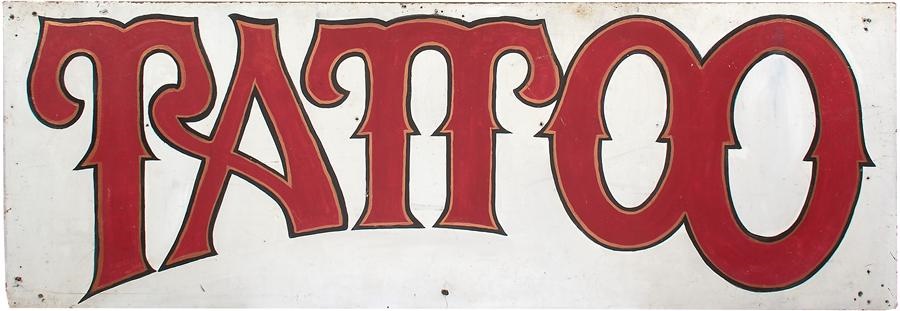A great piece of tattoo art unto itself, this was done by the tattoo artist and hung in his shop for decades. This gorgeous period piece in brilliant colors came from the Syracuse, New York, area. Outstanding 24x70" sign is painted on 1/2" plywood; all original, it has some holes where it was hung adding to the character. This is a fabulous future investment as tattoo art is becoming more and more important, and early, definitive pieces such as this one are highly scarce and collected. According to a 2013 New York Times article, the genre is making the transition from "cult to fine art." Important pieces have already brought prices in the millions at auction.