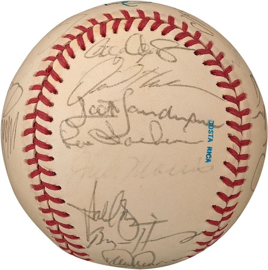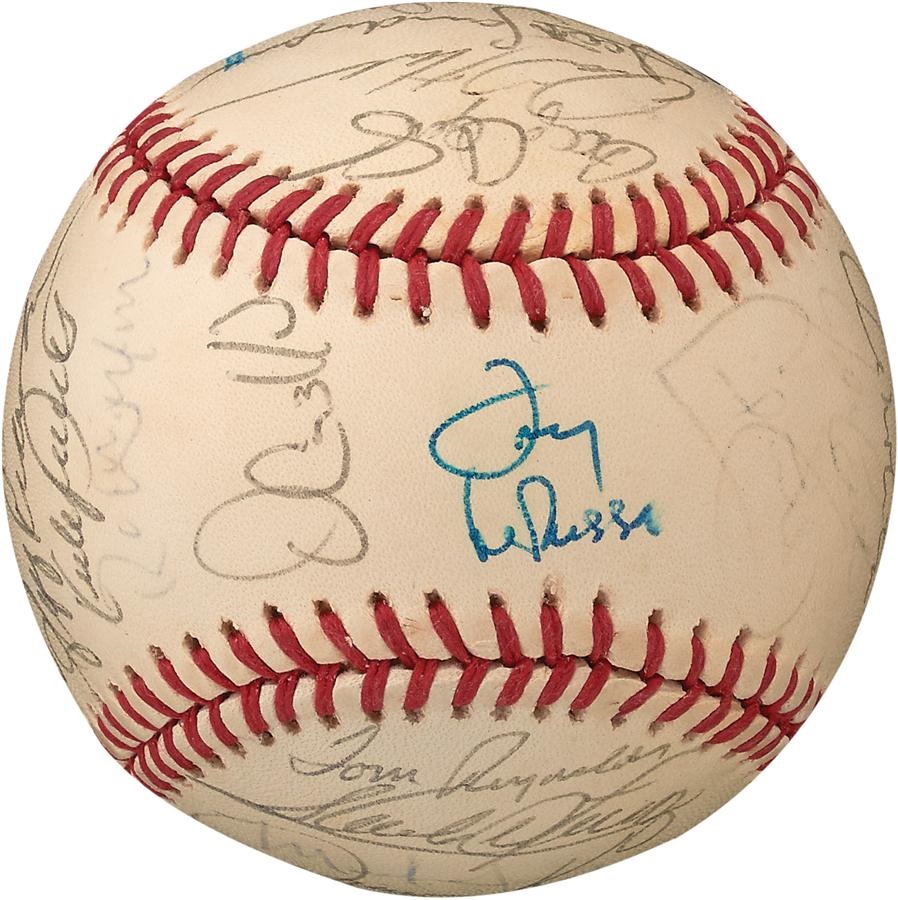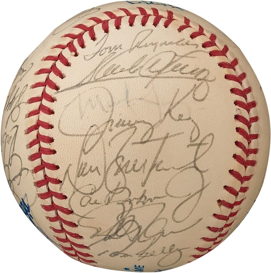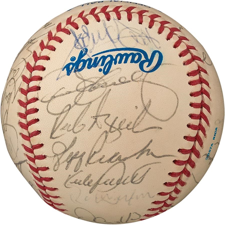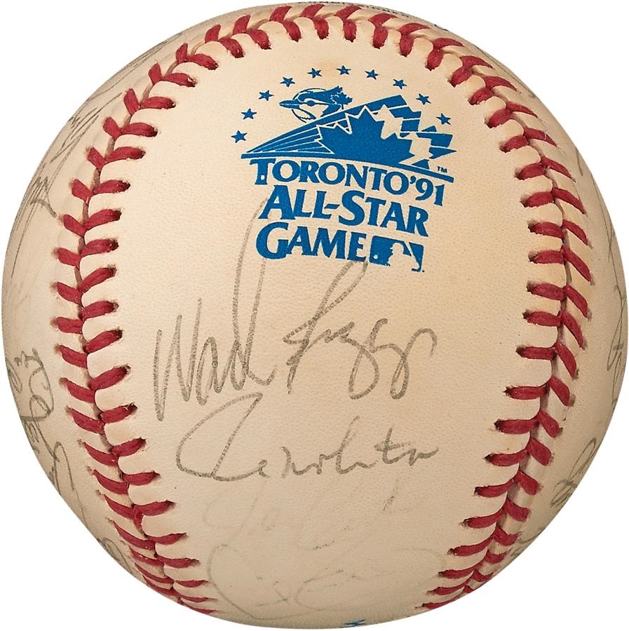 Offered is an authentic team signed 1991 Official All Star Game baseball, blessed by 35 members of the American League team. Signatures include: Kirby Puckett, Cal Ripken Jr., Rafael Palmiero, Roberto Alomar, Wade Boggs, Paul Molitor, Roger Clemens, Tony LaRussa, Dennis Eckersley, Harold Baines, Joe Carter, Cecil Fielder and more. Comes with an LOA from Leland's and is guaranteed 100% authentic.