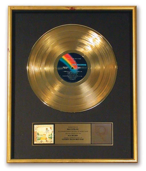 The classy and flashy, ever flamboyant Elton John rocks out on this 4-sided, 2-record set which earned MCA Records a Gold Record award. Named after the delicate and beautiful track, "Goodbye Yellow Brick Road," the album spent 91 weeks on the charts and reached #1 (1973). Gold-framed 17x21", NRMT.