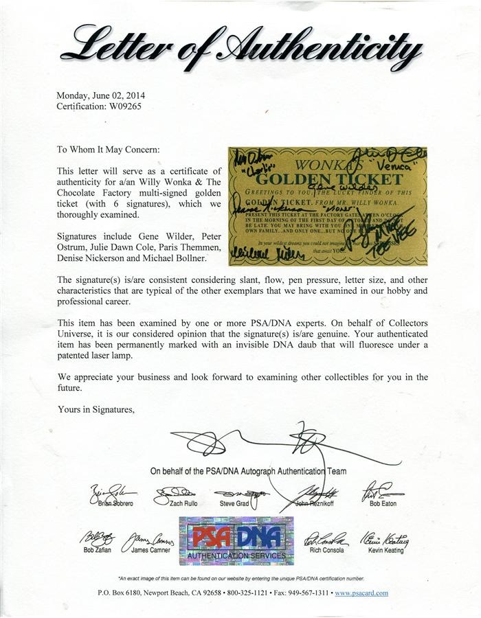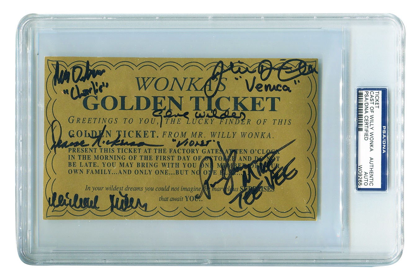 A golden souvenir, this is magnificent replica of the Willy Wonka Golden Ticket from the beloved 1971 film of the Roald Dahl classic children's book. A small number of these were done in a recent private signing on the west coast. According to the organizer of the signing, actor Gene Wilder, a very private man, said he will NOT do them again. Signed by Gene and all the golden ticket-winning children who appeared in this unforgettable musical, in beautiful black Sharpie. PSA/DNA slabbed "Authentic" with full letter.