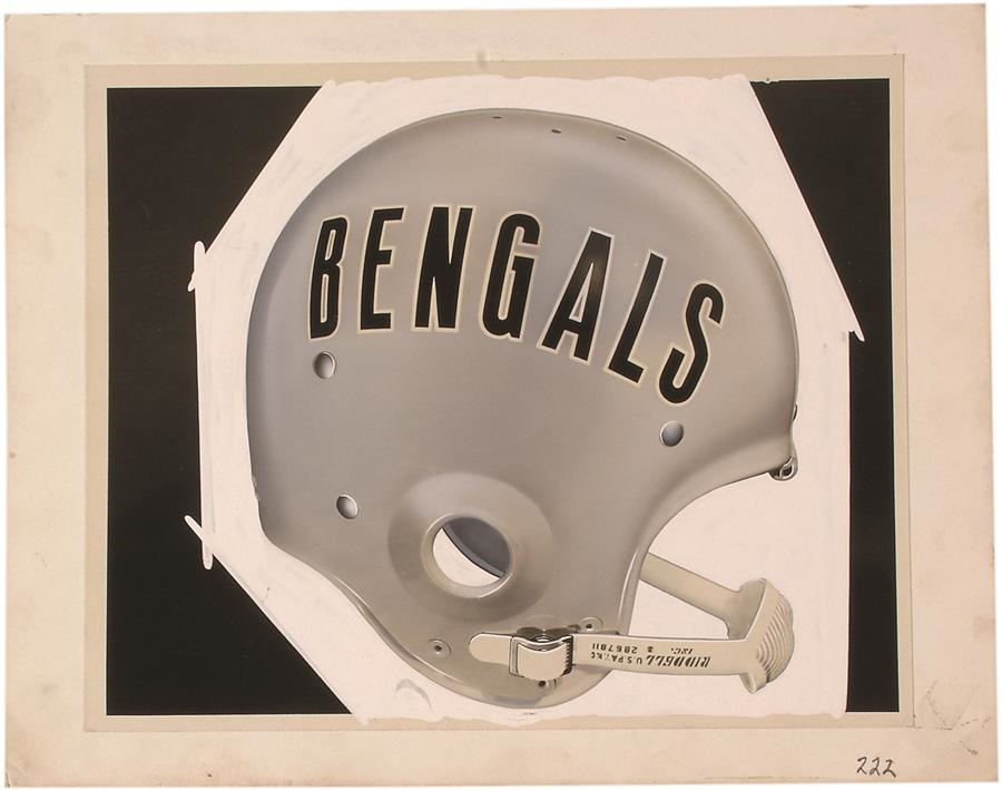 Though the team is now known for its jungle cat helmet style, the Cincinnati Bengals used to sport a more conservative logo during their first 12 years of existence (1968-79): block letters spelling out the team name. That is evident in the original artwork for the first Bengals helmet in 1968, which is offered in this artist's board. On the back is written: "Original prototype artwork submitted to and approved by Paul E. Brown for Cincinnati Bengal helmets." The original art is in EX condition.