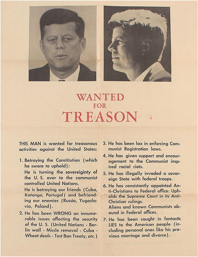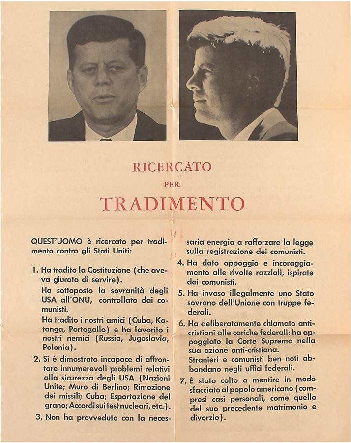 Anti-John F. Kennedy “Wanted for Treason” two-sided poster was an insert into an Italian magazine in 1967. Looks just like a flyer that was distributed around Dallas in the days leading up to Kennedy’s visit. Designed to resemble FBI Wanted posters, with Kennedy displayed as the criminal in question, with frontal and profile photos of Kennedy, along with a listing of seven treasonous "crimes" against the people of United States by the President. This anti-Kennedy campaign may have spurred Lee Harvey Oswald to kill the President. The reverse is exactly the same except it is printed in Italian. Condition is folded with two small tears, VG+ to EX, and it measures 28.625x22.625 ". See addendum at top for further info.
