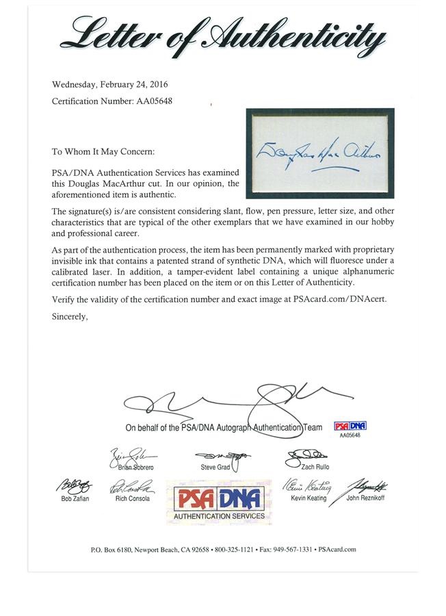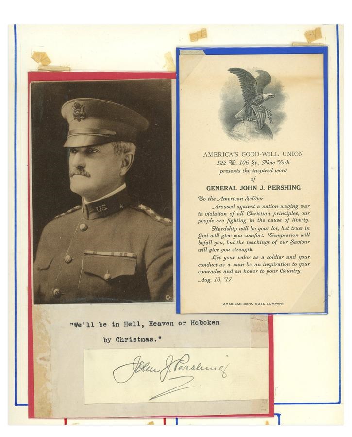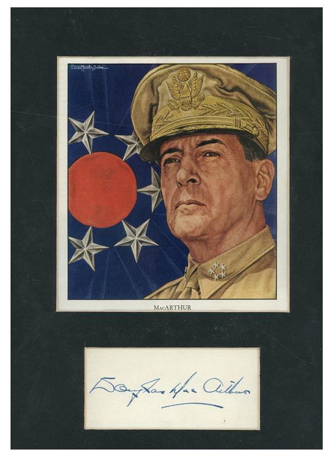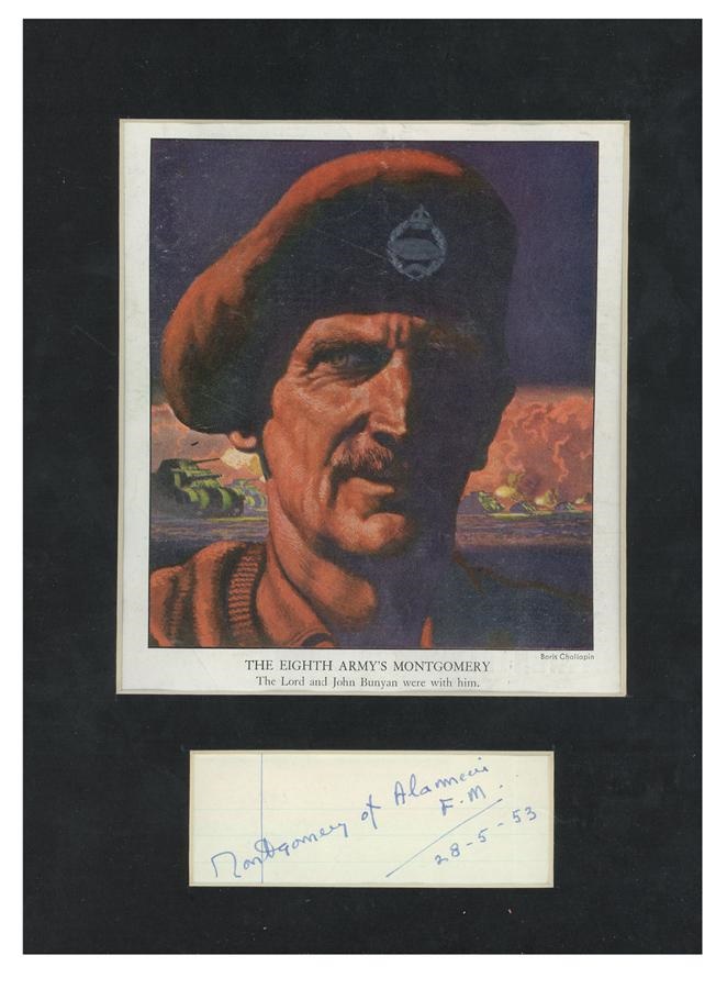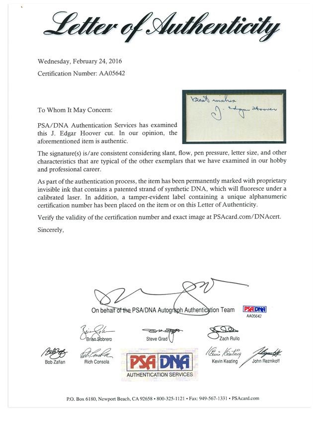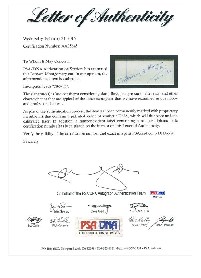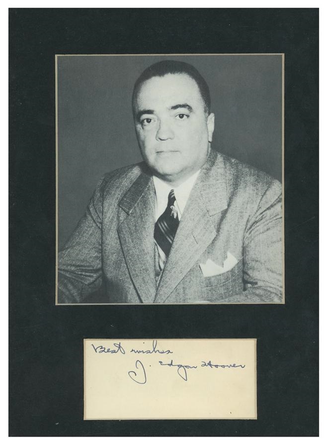 This collection consists of important historical and military figures from the 20th Century. The lot includes: 1) Typed cut with printed image signed by General John J. Pershing with a typed quote "We'll be in Hell, Heaven or Hoboken by Christmas." Wouldn't have thought he'd have such a good sense of humor, the autograph is nice. Taped to card, the overall condition is VG. 2) Display with signed cut, autograph is 10/10 overall display with color print is EX-MT and measures 9x12". 3) A 9x12" display with color print and autographed cut of Montgomery of Alamein, British field marshal and one of the outstanding Allied commanders in World War II. Cut is dated May 28, 1953, and overall condition is EX+. 4) Cut and image of J. Edgar Hoover, head of the FBI and one of the most divisive people of the 20th Century. Autograph and display measures 9x12" and is EX-MT. Each item has a separate full letter from PSA/DNA.
