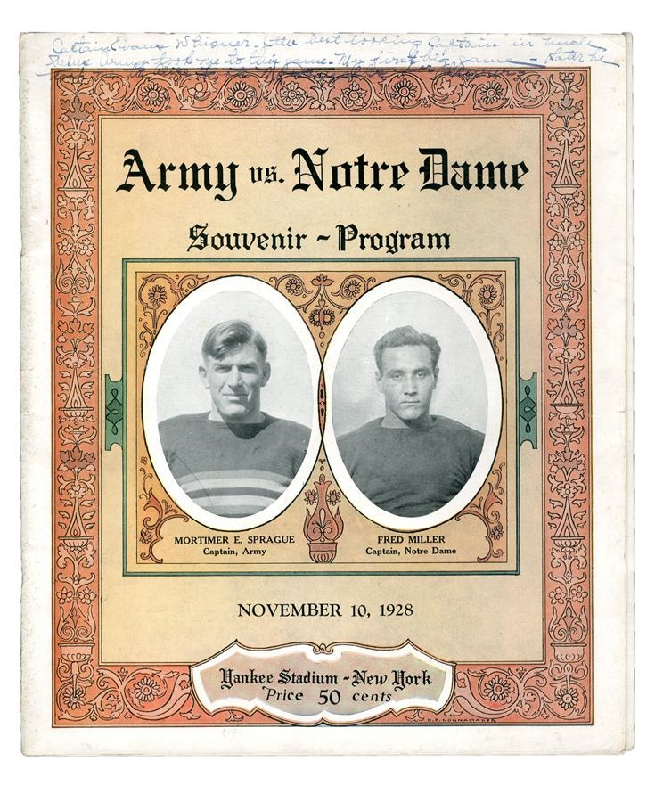 Here's a tough to find original game program from one of the most historic games in any sport. The legend is that George Gipp, from his hospital bed, delivered the famous speech to the great Knute Rockne: "I've got to go, Rock. It's all right. I'm not afraid. Some time, Rock, when the team is up against it, when things are wrong and the breaks are beating the boys, ask them to go in there with all they've got and win just one for the Gipper. I don't know where I'll be then, Rock. But I'll know about it, and I'll be happy." Rockne used this to rally Notre Dame to a 12-6 upset of undefeated Army, with Jack Chevigny (who was KIA in Iwo Jima) scoring the famous "That's One for the Gipper" touchdown. Later used as a political slogan by Ronald Reagan, who portrayed Gipp in the 1940 film "Knute Rockne, All American" and was often referred to as "The Gipper." He used the phrase most famously at the 1988 Republican National Convention when he told VP George Bush, "George, go out there and win one for the Gipper." In turn, at the 2004 Republican Convention Bush honored the recently deceased President, "This time we can truly win one for the Gipper." Vintage writing on the cover is by the original owner r.e. "My first big game..." otherwise EX with some archival tape on inside spine.