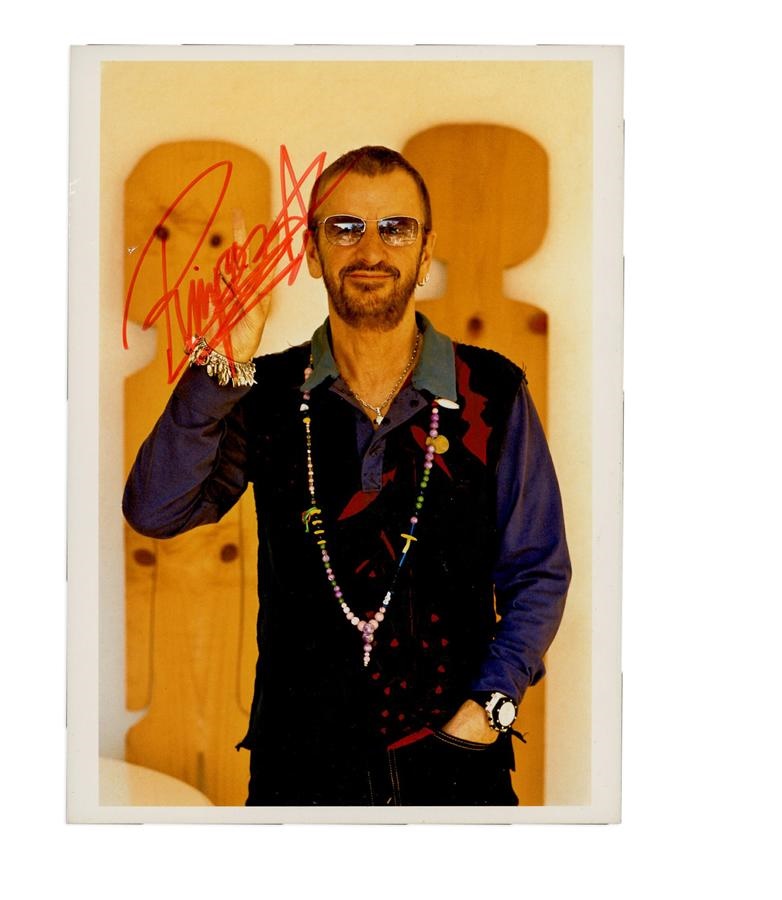 This is an unusual "official" photo of Ringo Starr, signed for some publicity campaign. It bears red magic marker signatures, is a 1980s issue and the first we have seen, measuring 5x7" and in EX-MT condition.