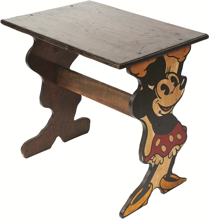 Kroehler Manufacturing Company produced this highly desirable series of Disney figural furniture along with other pieces including chairs, bookshelf and this marvelous table offered here. Mickey and Minnie stand at either side guarding your most desired toys. It displays some minor wear and remains structurally sound with truly nice imagery. Overall very good.