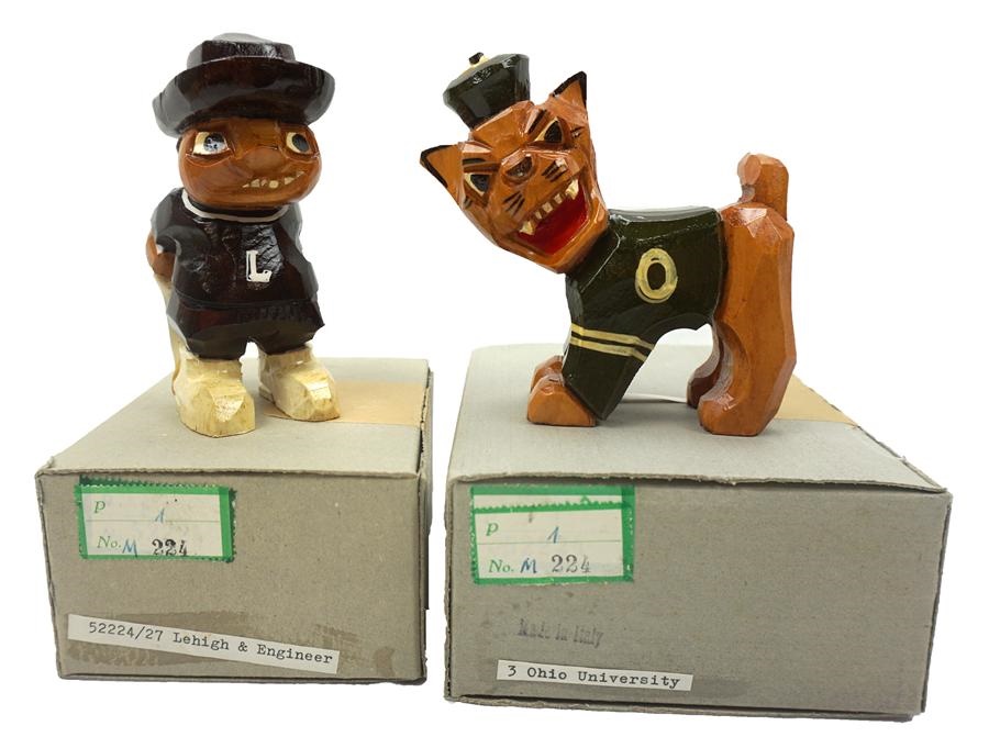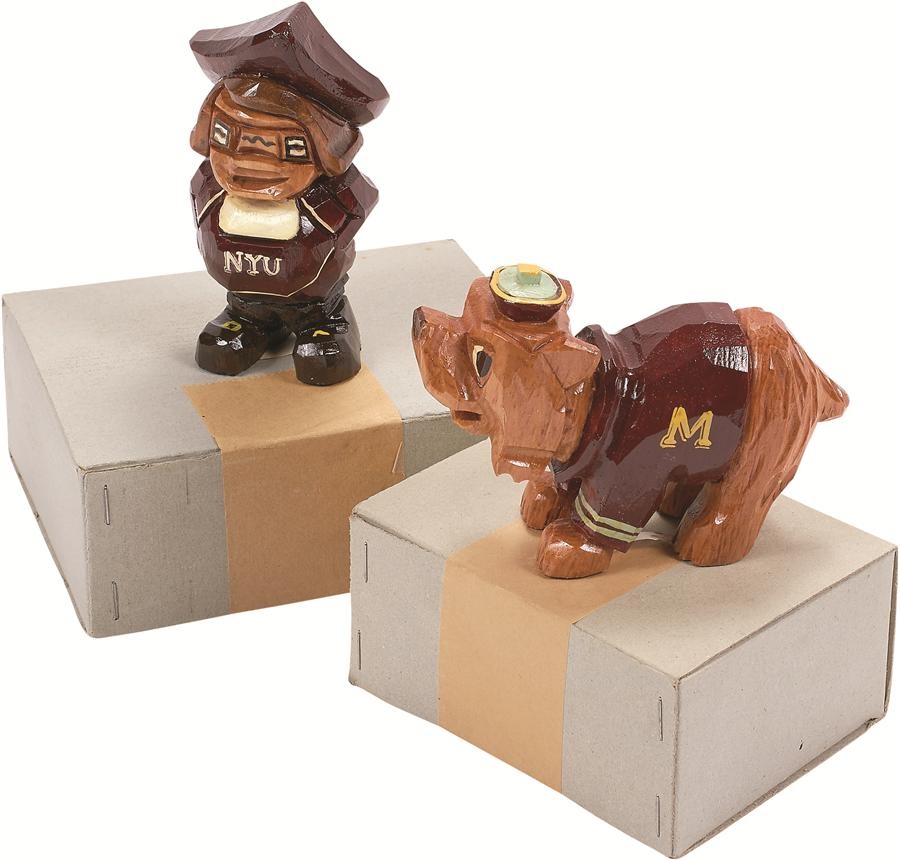 Untouched for nearly seven decades, these Anri collegiate mascots are all wrapped in their original tissue paper, housed in their 1950s boxes and contain the original paper labels still attached to their bases. The schools are: Montana, Lehigh, New York University and Ohio University. Each statue is in MT condition as they came from an unopened stock discovered in a store in Nantucket. When the proprietor died, her family liquidated her estate, in which over 1,500 mascots were sold for $6 apiece.