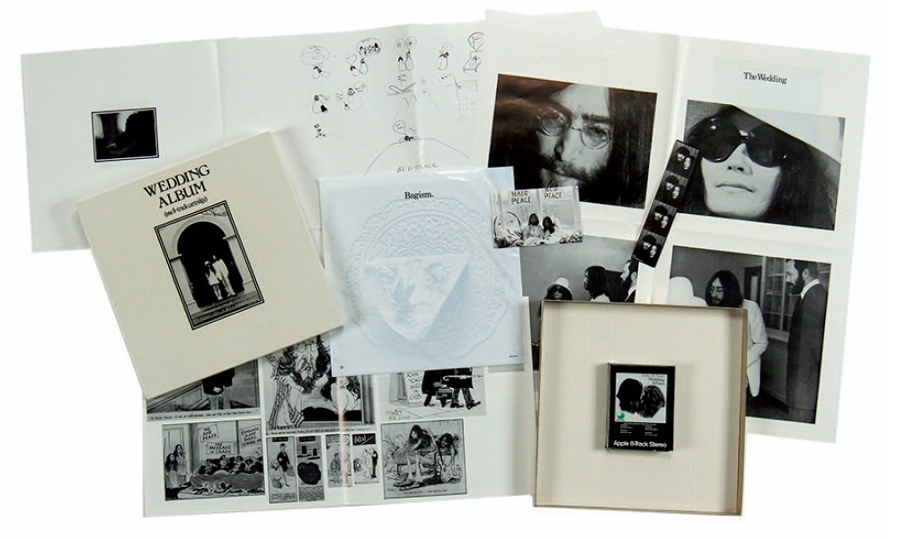 Imagine... an unopened copy of the 1969 experimental album box by then-newlyweds John Lennon and Yoko Ono, from a shipping of these which belonged to Lennon himself. Contains not just the 8-track tape but a copy of the wedding certificate, a booklet of photos from the wedding, another of press clippings, a poster, a photo of a piece of the wedding cake in a bag, a postcard and photo strip of the happy couple. Comes with a Leland's LOA.