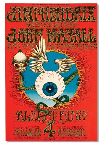 One of the most widely recognized image in rock n' roll, Rick Griffin's "Flying Eyeball." Known worldwide, this eyeball appears painted or printed on everything from tribal skulls in the Thailand jungles to t-shirts in the Chilean desert. It is the artist's own personal vision, done for a 1968 concert by Jimi Hendrix, John Marshall, & Albert King. Note that this is not just a trademark like the Stones' "Lips" or Led Zeppelin's "Obelisk". It is a much more profound idea reflecting Griffin's fear of the all-seeing eye of God, the father. Reminiscent of Walt Whitman's "transparent eyeball" in nature. Colors are bold and flamboyant on this second printing. Framed to 19x27" and NRMT.