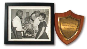 Important plaque presented to Jackie by his teammates on his Jackie Robinson Day at Ebbets Field in 1947. Their first ever tribute to him, it declares in plated brass, "To Jackie Robinson of the Brooklyn Dodgers Who Was the First and Who Through His Efforts Will Never Be The Last." On luxurious rosewood plaque (8"). Comes with framed photograph of Jackie with son Jackie Junior and wife Rachel right after his 1957 retirement. They are in their trophy room and this plaque has a place of honor in a key place on his trophy wall. EX-MT. Of all the awards presented to Jackie this was the only one with content of being "The First." LOA from Rachel Robinson.