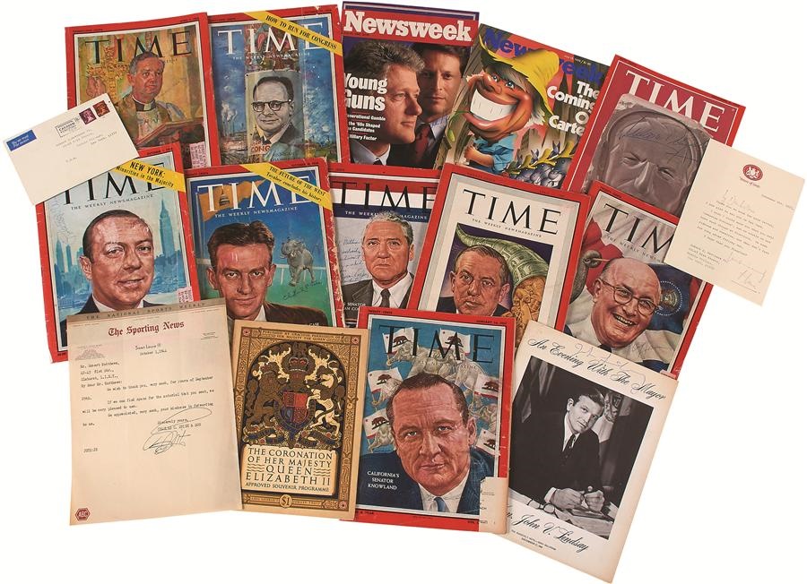 This is a nice selection of autographs and more of great historical figures and world leaders. There are ten (10) signed Time magazines: Bill Clinton & Al Gore, Nelson Rockefeller, Robert Wagner, Franklin Clark Fry, William Knowland, Clifford P. Case, Leonard Hall, Charles Chamberlain, Paul Hoffman, John Sherman Cooper (cover only). Other signed items include: Malcolm S. Forbes signed letter, Robert Taft signed newspaper photo, Jimmy Carter signed Newsweek, John Lindsay signed 1968 program, Charles Spink signed letter, Frank Borman signed letter, Tip O'Neill signed pamphlet, Hedda Hopper, Helen Hayes, Dorothy & Lillian Gish, Anita Loos, Peggy Wood signed envelope, plus Queen Elizabeth program with signed letter by "Howie."