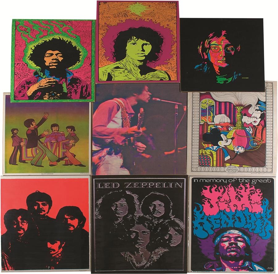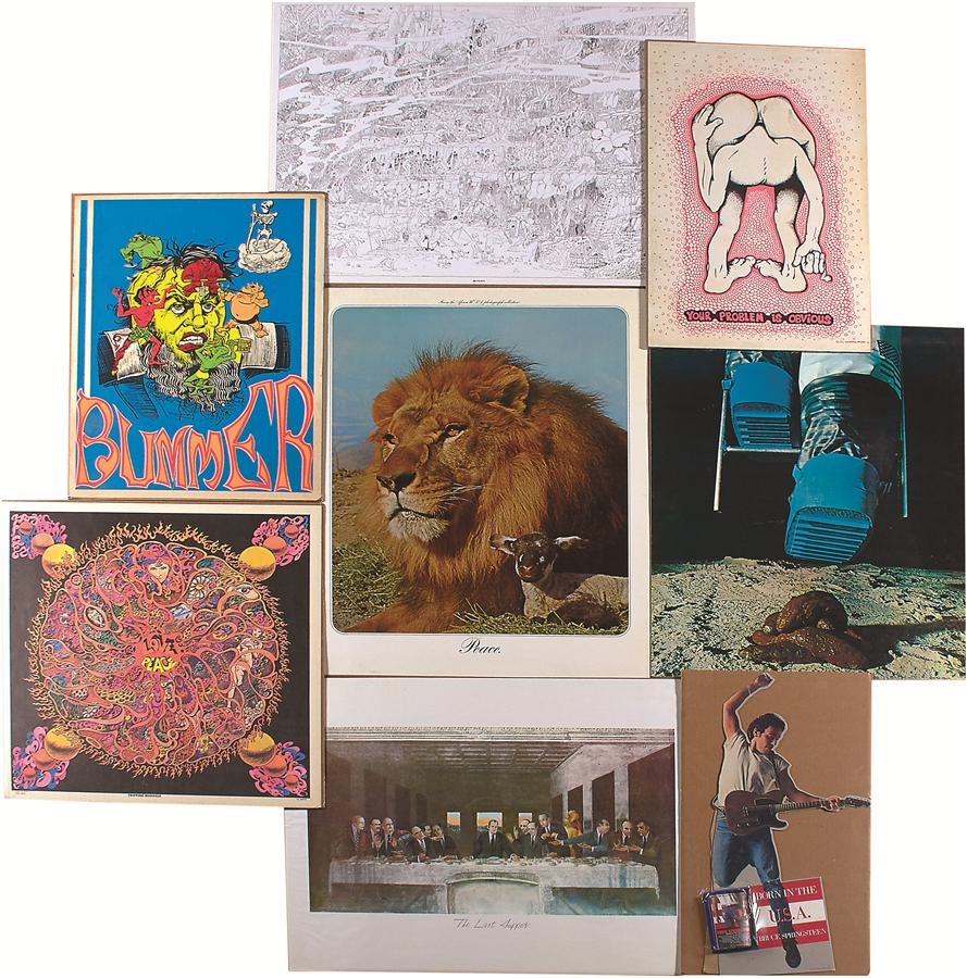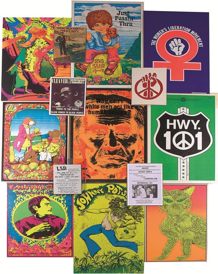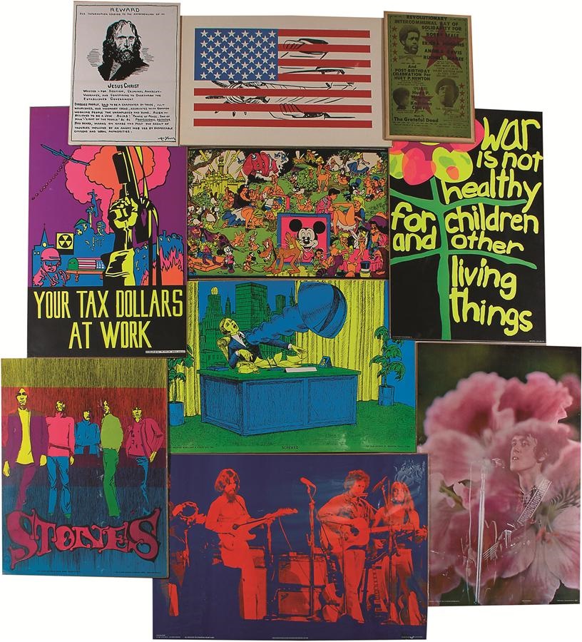 This visual kaleidoscope takes a trip back to a time and place so different or the same, depending upon your perspective. There is about a 60/40 split of music and current events, and all the best bands are here: the Beatles, Rolling Stones, Doors, Led Zep, Bangladesh (funds go to Bangladesh refugees), Dylan, Hendrix and more (more complete list available online). The pop culture of the time was dominated by Vietnam, dope and the hippie movement. Highlights include Disney characters smoking weed in big hookahs. (Ain't Gonna Work On Dizzy's Farm No More $1000 Poster) and more. VG+ condition overall, most measure about 36x24".