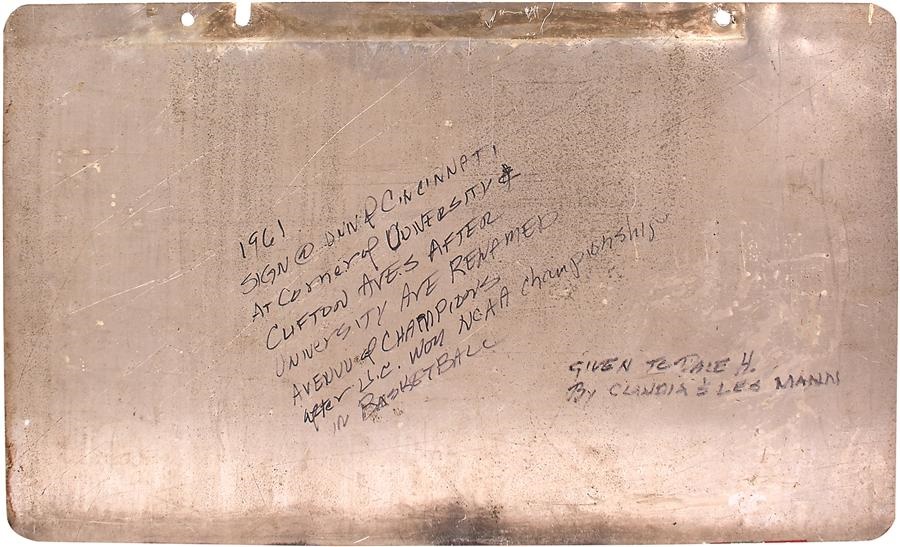 This red-and-black street sign hung at the corner of University and Clifton in 1961 after the University of Cincinnati Bearcats won the NCAA basketball championship. Measuring 30x18", it has the original owner's name on the back with details of where it hung, indicating that it replaced "University Avenue" in honor of the national title. It has mounting holes, a few wrinkles to the metal and some minor scratches.