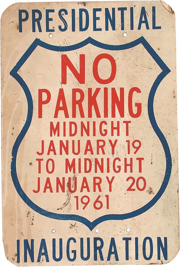 Dating from the Presidential Inauguration of John F. Kennedy in 1961, this metal "No Parking" sign was found in an estate sale. It originates from a woman whose husband was in the University of Kentucky Marching Band, which performed that day. Folklore has it that she said, with a twinkle in her eye, "and somehow the sign wound up in our home." Measuring 12x18", the back shows extensive rust and there is some bending at the corners, but as these signs are not particularly common, this is a fun and interesting find.