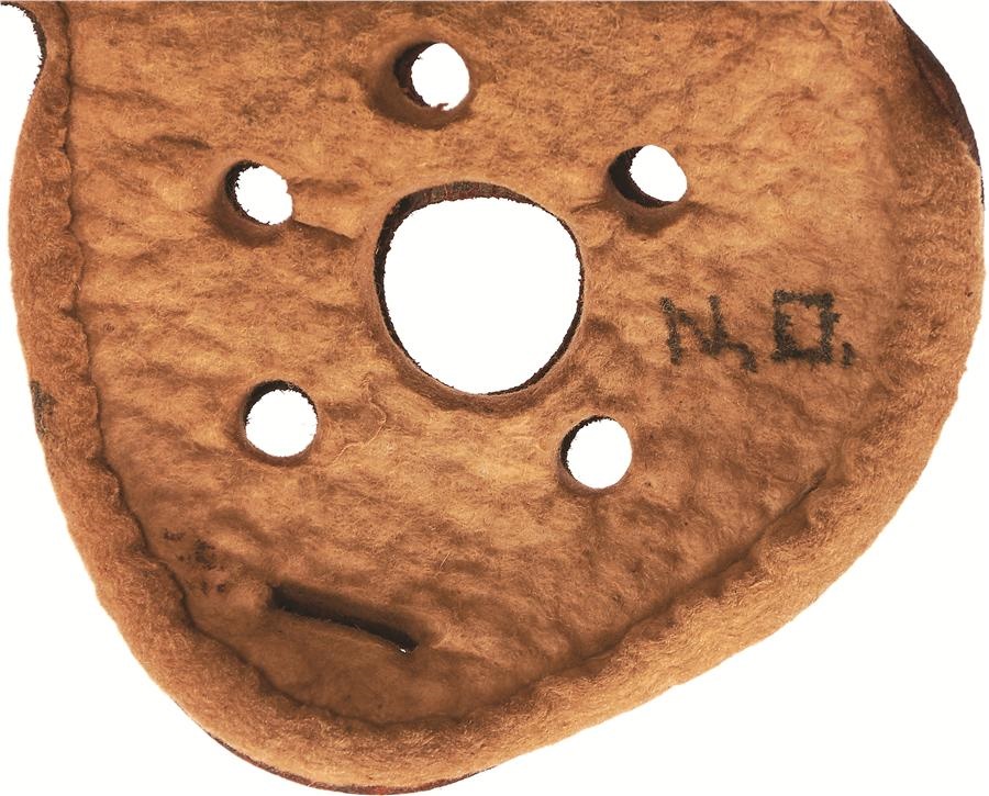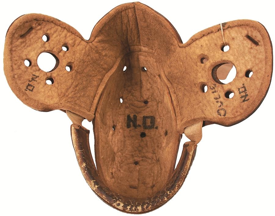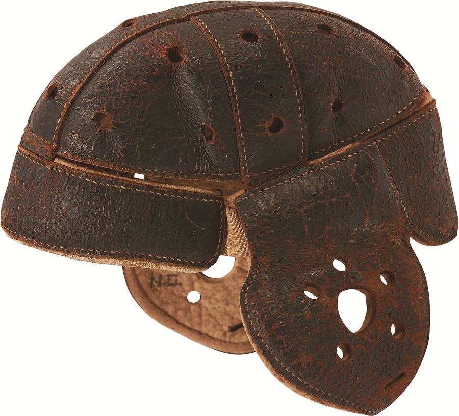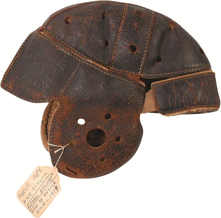 Six great vintage football items are up for grabs: 1) Vintage 1919 leather helmet with tag stating it came from Manual Arts High School, includes the player's name, Nestor Oulie. 2-4) Circa 1940s uniform worn by famed Mexico City football player Manuel "Pibe" Villari, includes helmet, jersey and long socks. 5) Princeton University football helmet with chinstrap, circa 1960s. 6) A pair of early leather hightop cleats; the cleats themselves are particularly long, possibly for traction on a surface that was often muddy. These items show various degrees of use and are offered as is.