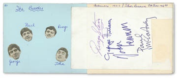 An autograph album which contains the signatures of the Beatles. These signatures are on the back of a rare Parlophone promo card.  Paul has signed in dark blue fountain pen; the others in blue ballpoint.  These signatures date from February of 1963.  This card has been glued into the book, which contains the signatures of other artists, including The Jaywalkers, The Innocents, and the Saints.  Comes with a COA from R&R Enterprises.