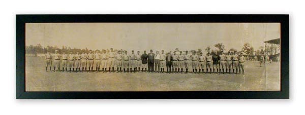 The National League pennant winners pose before the beginning of that glorious season. Spring training shot features stars like Dave Bancroft and Eppa Rixey, who smile in the Florida heat for the photographer. It appears that the photograph was stored rolled up for years, causing several vertical cracks which become more pronounced at the photo's edges. The center looks really great though, and the sides are worn but not enough to be truly bothersome. Overall it looks great, very appealing. And, at its age, you'll find none better, if you can find one at all.