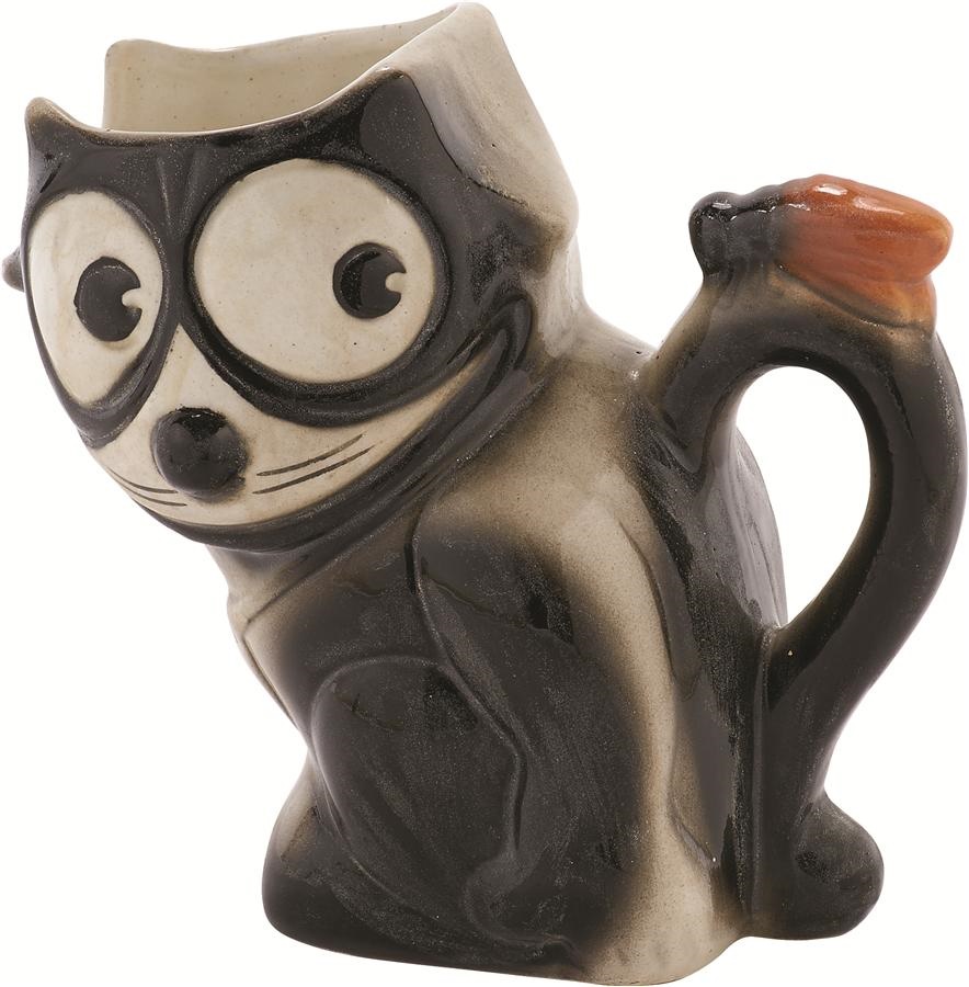 Two great Felix items combine to make one great lot. First, a googly-eyed figural ceramic pitcher extremely desirable to Felix collectors measures 6" high with decorative "FELIX" on his collar. The second item is a wooden carnival cane with a figural porcelain head and celluloid eyes that move from side to side, a rare carnival piece. Condition is EX-MT.