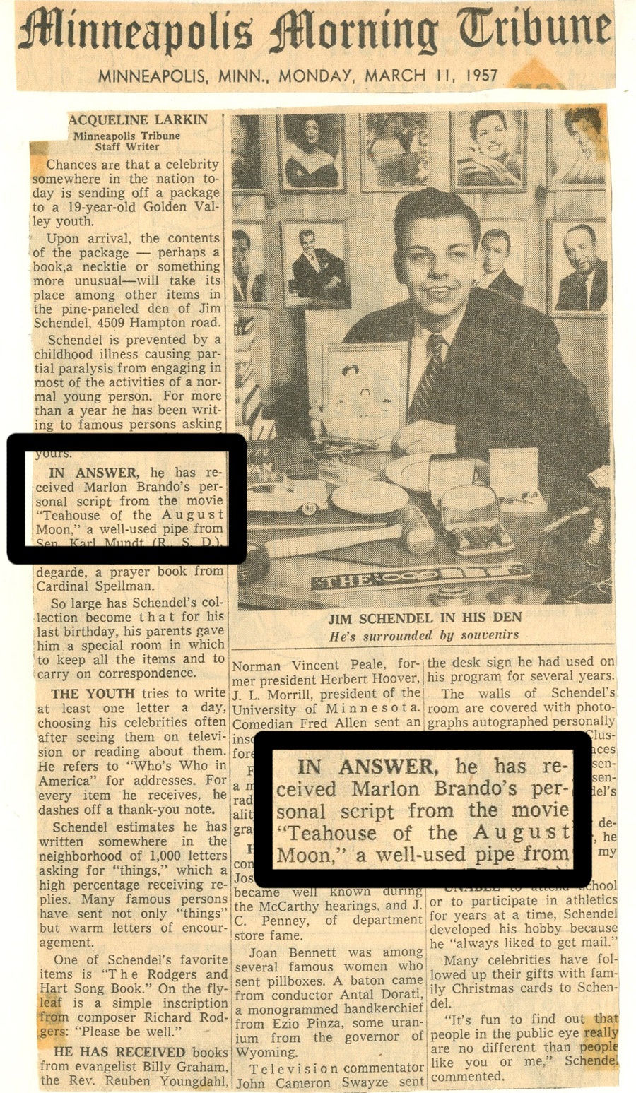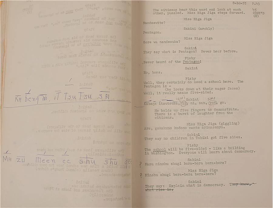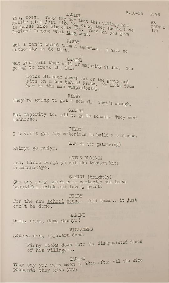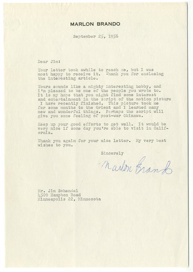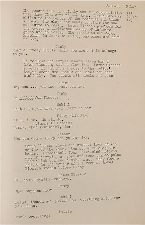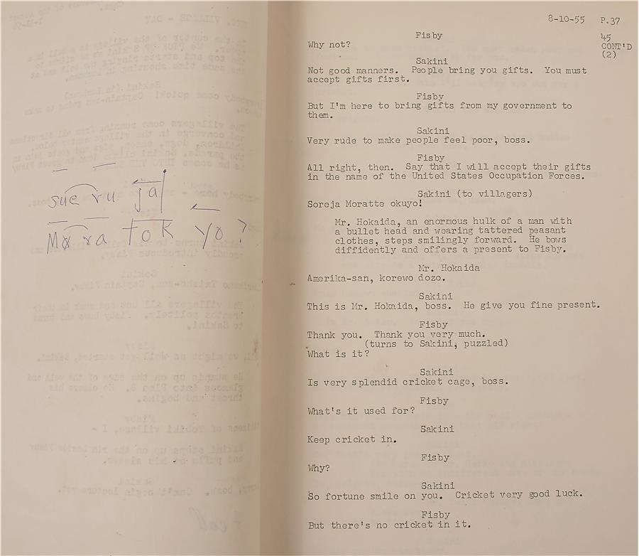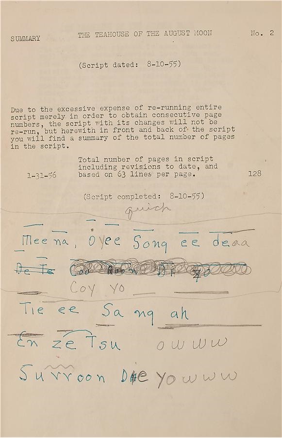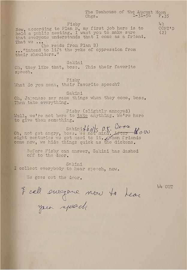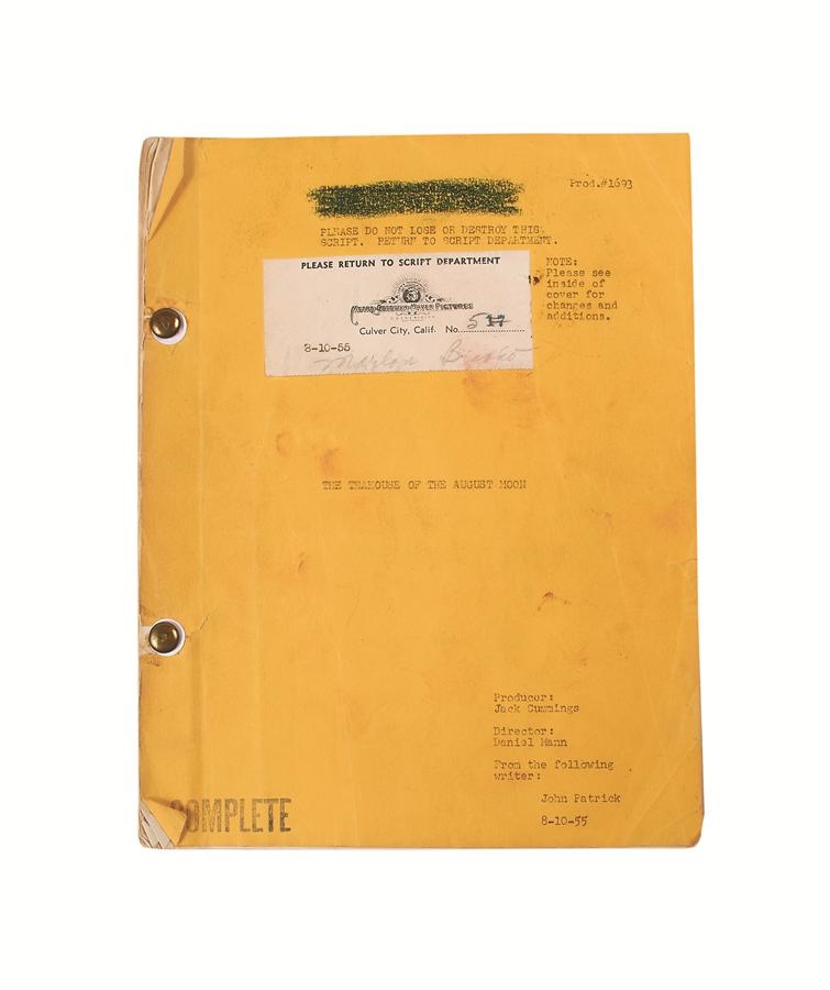 As the scars from World War II faded, the emphasis increased on trying to understand and accept cultures that had been considered "enemy." Marlon Brando's 1956 "The Teahouse of the August Moon" is credited with attempting to bridge some of that gap, and this is his original 132-page personal working copy script. There's a label on the cover from Metro Goldwyn Mayer (MGM) with "Marlon Brando" handwritten in his own hand, and pronunciation notes on the inside cover. Brando himself added notations to several pages, for example, writing on page 35, "I call everyone now to hear your speech" along with "that's okay Boss" and an unknown word, and on the back of page 106 is a drawing by Brando. There is some creasing and a minor tear on the cover and some pages show the expected minor creasing from use on the bottom corners and some edges. While the film has not aged well and could easily be accused of being stereotypical today, like many of the era it remains an important piece when considered in the context of the time. -Comes with a signed letter from Brando dated September 25, 1956 in which Brando says "It is my hope that you might find some interest and entertainment in the script of the motion picture I have recently finished". Brando then went on to say "Perhaps the script will give you some feeling of post-war Okinawa" thus confirming it is from "The Teahouse of the August Moon".