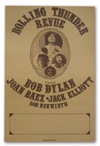 One of the legendary markers in Dylan's long and illustrious career was the Rolling Thunder Revue, which was an unusual collection of musicians who stormed across America like a band of gypsies. The assemblage included Joan Baez and Roger McGuinn, amongst many others. Here's a very rare unused tour poster from this legendary tour in 1975 and 1976. EX, with a few horizontal creases.