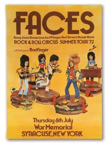 The Rock and Roll Circus Summer Tour '72 starred the Faces with Rod Stewart, Ronnie Lane, Ronnie Wood, and their guests, Badfinger, July 6th at the Syracuse War Memorial in New York. Delightful whimsical design. 20 x 30". EX.