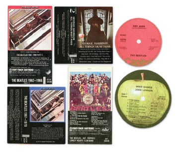A fascinating, varied assortment of labels for both UK and domestic LP's, 45's, 8 tracks and cassette tapes. This lot of 76 pieces vividly represents the various product labeling of The Fabulous Four's record output -- all before the CD era. Includes 50 record labels: 17 for LP's, 33 for 45's (with both large and small holes and some unpunched), 16 for cassettes and 10 for the 8 track format. Have fun.