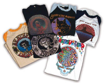 A fantastic array of "Deadwear" awaits the fan in this super lot of no less than 30 different shirts. Also features offshoot bands Bobby & The Midnites, Jerry Garcia Band, Mickey Hart & Weir/ Wasserman, as well as a full assortment by the band itself. These 29 tees and one black sweatshirt with logos that truly run the gamut of familiar images are sure to please. The lush colors and occasional whimsy which were the essence of the Dead will delight any true follower of this warmly regarded 1960s West Coast institution. All sizes, no duplication.