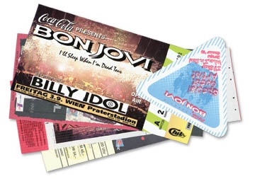 This European collection consists of twenty five of each of the following in pristine Near Mint condition. Triangular shape "Special Guest Artist" backstage passes, large (up to 9") unused colorful concert tickets with Billy Idol at Monza, with Billy Idol in Munchen 1993, Kiel Ostseehalle, 9/93, 9/18/93 "I'll Sleep When I'm Dead Tour," and Freitag; most have Bon Jovi pictures.