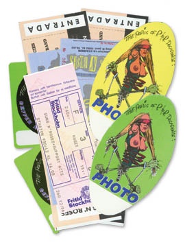 From Guns' classic 'Perils of R&R Decadence' tour we have 25 unused Geffen Records Hospitality backstage passes, 10 oval photo backstage passes (Robert Williams art?), 25 Guns large German unused concert tickets 6/16/93, 25 unused Stockjolm tickets, 25 large colorful Spanish tickets with Brian May, and 25 Gentofte Eurpoean unused tickets. What a haul! All NrMt.