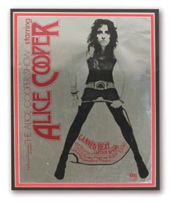The most striking Alice Cooper poster we've seen is this rare foil poster announcing Alice Cooper's July 1972 concert at Manzanita Speedway in Phoenix, Arizona. Beautifully double matted and framed. Framed 24 x 29". Poster is EX with some creases.