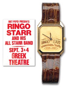 Ringo's Rolex -- no, just kidding. This is a Jostens Medallion Timepiece. It is an extremely rare 1989 Tour Gift and was awarded to Ringo, the All Starr Band members and a few, select lucky associates. The gold rectangular face reads "R.S. and his All Starr Band Tour 1989." It is adorned with one large star and six small ones. It is Mint and unusued in its original case with paperwork. To compliment this lot is a 15"x22" cardboard concert poster for his All Starrs at the Greek Theatre.