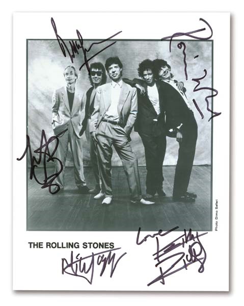 An original 8X10 promo photo personally autographed by all five members: Mick Jagger, Keith Richards, Bill Wyman, Charlie Watts and Ron Wood. Photos authentically signed by all five (with the departed Wyman) have become very scarce and are in high demand. Mint example of a Dimo Safari photo.