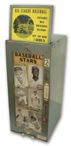 With guys like this behind the display glass, this machine must have been brimming with pennies back in the day. Two-penny cards pictured include Banks, Killebrew and Maris. Sign affixed to top reads, "Big League Baseball, Pictures with Individual Records, Get 'em Here, 1 Card 2c." Vintage patina with typical wear, but condition is great and fully-operational.