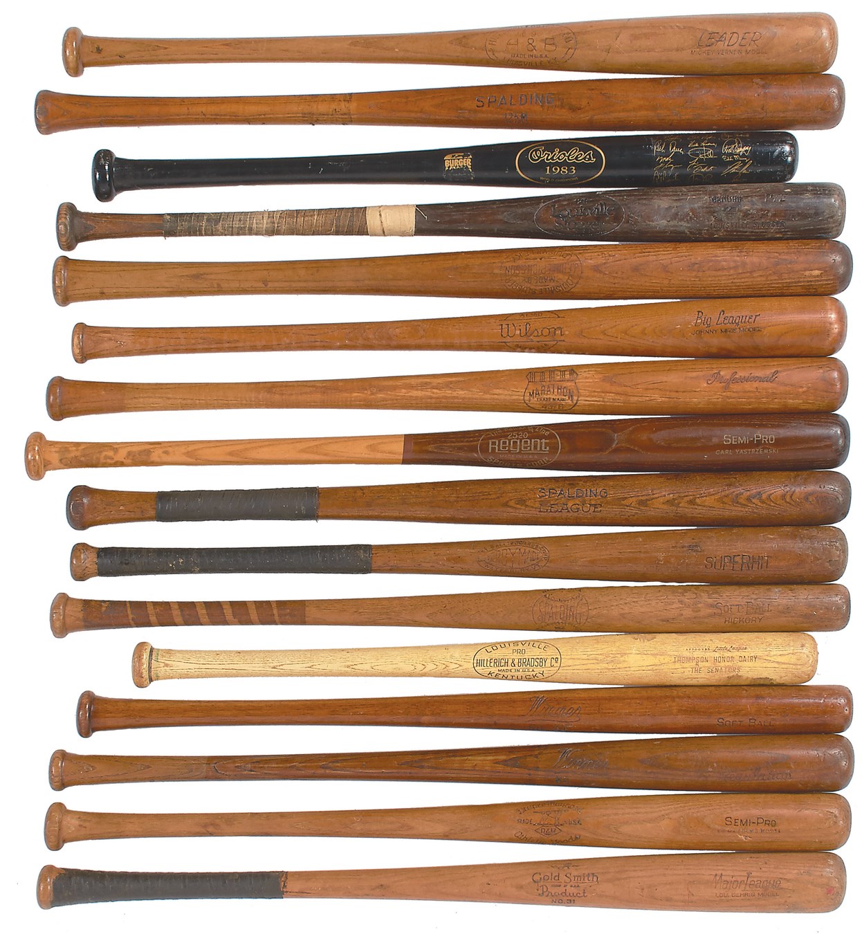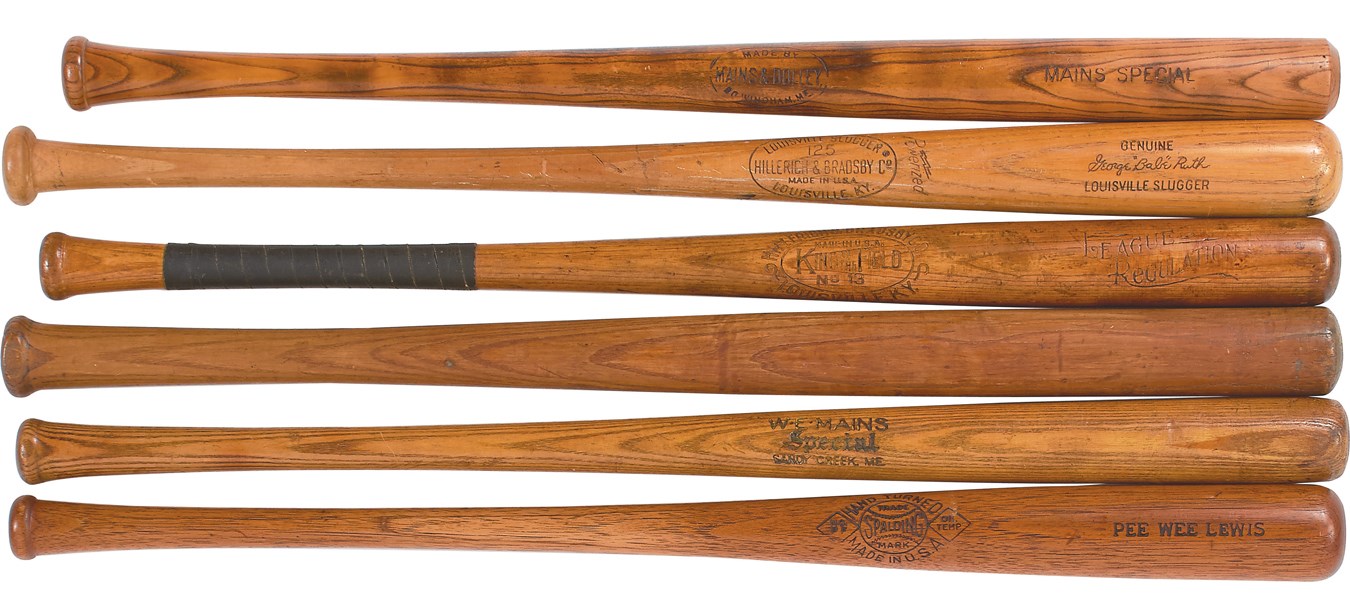 Some killer pieces here from the 19th century to the 1930s with just a few later: 1) Early JF Hillerich. 2) W.E. Mains "Special." 3) Marathon w/1932 Olympic style logo. 4) Great early "Zimmerman" with BEAUTIFUL logo. 5) Draper & Maynard w/dog. 6) Early Hillerich & Bradsby King of the Field. 7) Main & Dolley with simply amazing and extremely unusual grain (one of the more interesting bats you will see). 8) Spalding game used Pee Wee Lewis (played one season for the 1896 Philadelphia Phillies, light use). 9-10) 1960s Babe Ruth Pro Model (nice) & 1930s 40BR (rough). 11) 1910s Spalding 125M. 12) The best of the lot, a beautiful 1880s or earlier model, extremely thick handled of the era style, PROFESSIONAL quality bat (24"). Awesome hunk of lumber. Plus many more. Collection overall is in EX condition.