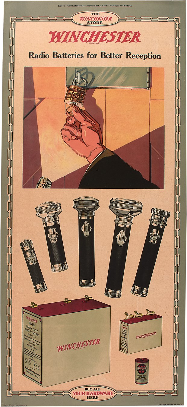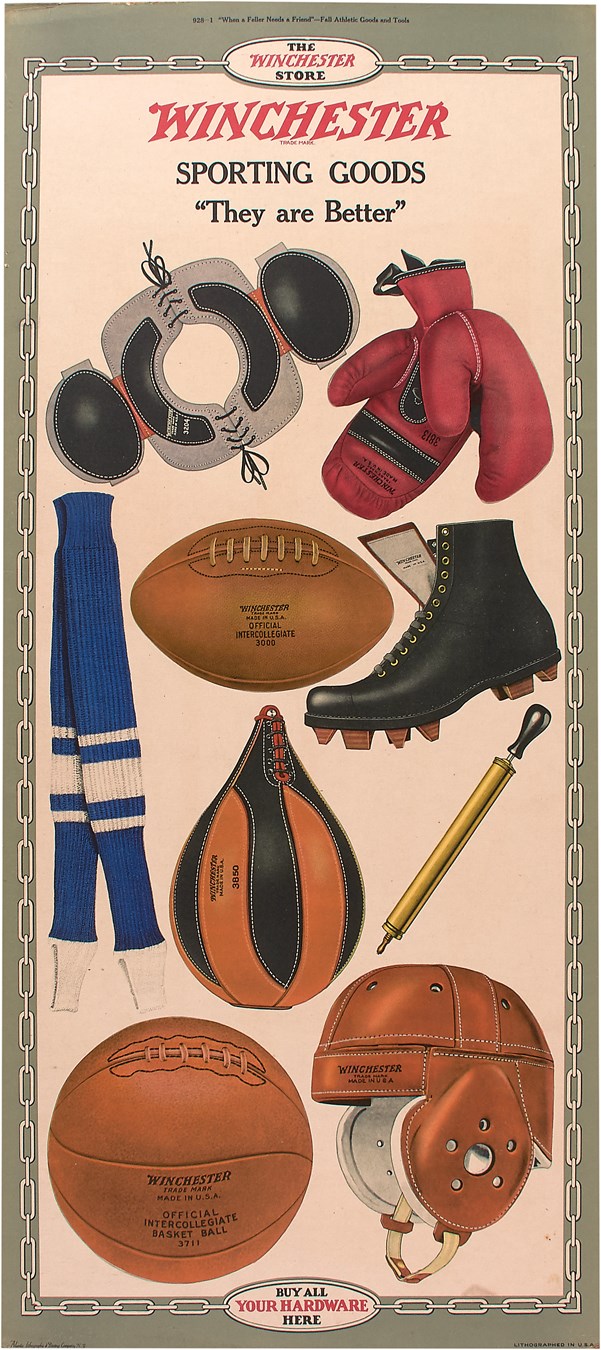 A great crossover piece of guns and sports, this 1920s cardboard advertising display is double-sided with one showing full color sporting goods provided by Winchester; football shoulder pads, helmet, football, leggins and cleats, boxing gloves, speed bag, basketball and pneumatic pump. The other side pitches Winchester batteries, flashlights and a lock. It measures 18x42" and has slight wear at the edges and some chipping at the top, but the body of this display is very clean and could easily be mistaken for a modern reproduction, it is in overall EX condition.
