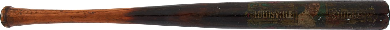 A vintage beaut, this mini decal bat features a color portrait of Joe Jackson wearing a Cleveland hat and reads "Louisville Slugger." There's some fading to the decal, which is darkening but viewable, the bat measures 14". Jackson was famously embroiled in the Chicago Black Sox scandal of 1919, when eight members of the team were banished from baseball.