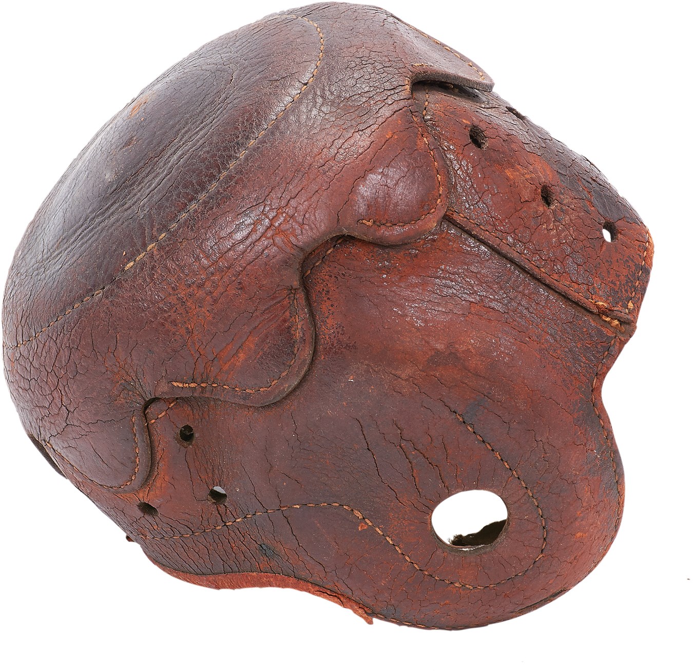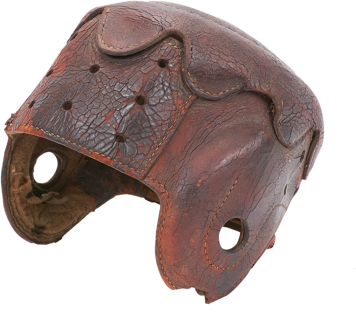 A throwback to the first quarter of the 20th century, this vintage helmet is a very rare style. It shows use and some of the stitches are loose but it still displays great. Though the chin strap is missing, the leather that covers the top of the head is cut in a scalloped pattern around the edges, giving this style a distinctive look. As is consistent with the style, there is little padding, a sign of a very different era in football history.