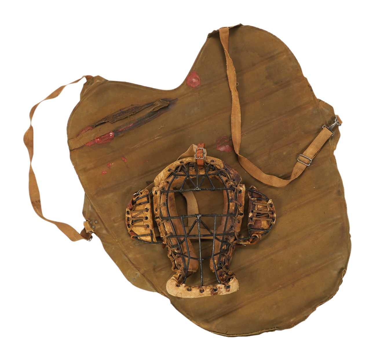 This pair of amazing items of umpires' protective gear dates from the 1910s. The very rare mask has ear flaps that swivel, throat protector, and adjustable lace-and-buckle fasteners, rating in Very Good condition with original padding and straps. There is some cracking of the padding from age, but it still looks and feels as though it can do the job. Something of a curiosity, the canvas chest protector is actually intended to be inflatable, also in Very Good with original straps but no longer holds air. A wonderful duo from one of sports' most difficult and thankless professions.