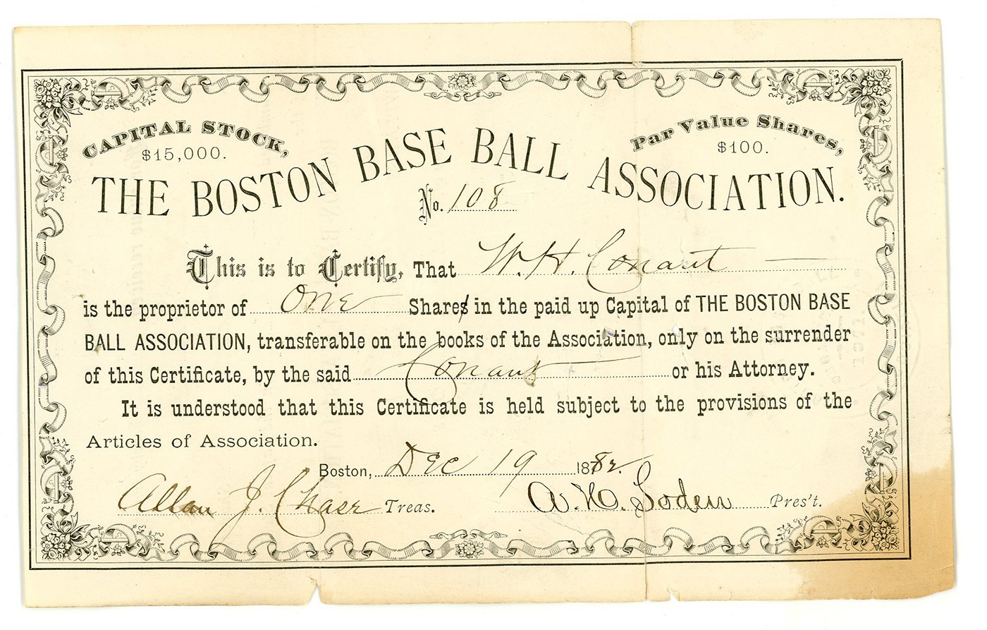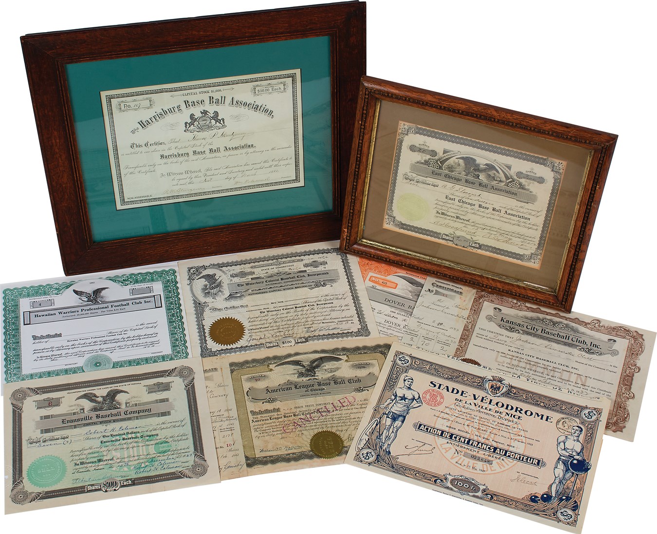 Take stock with this great selection of 10 certificates dating as far back as the late 1800s. 1) 1884 Harrisburg BBA stock cert to Thomas Montgomery (framed). 2) 1912 East Chicago BBA stock cert made to AG Slocomb (framed). 3) 1937 Dover BBC Stock cert. 4) 1933 Kansan City BBC stock cert to the Jackson Democratic Club. 5) 1948 Waterbury Colonial BBC incorporated stock cert made to Mary Lang. 6) 1927 Evansville Baseball Company Stock Cert to Robert Coleman. 7) Cancelled 1941 American League Base Ball Club of Chicago stock cert made to Grace Reidy Comiskey for 2,178 shares. 8) 1882 Boston Baseball Association Stock cert. 9) 1962 transfer of 2499 shares to the American League Baseball Club of Chicago. 10) Blank 1982 Hawaiian Warriors Professional football club stock cert. 11) 1925 French Stade Velodrome with coupons. All unframed unless noted.