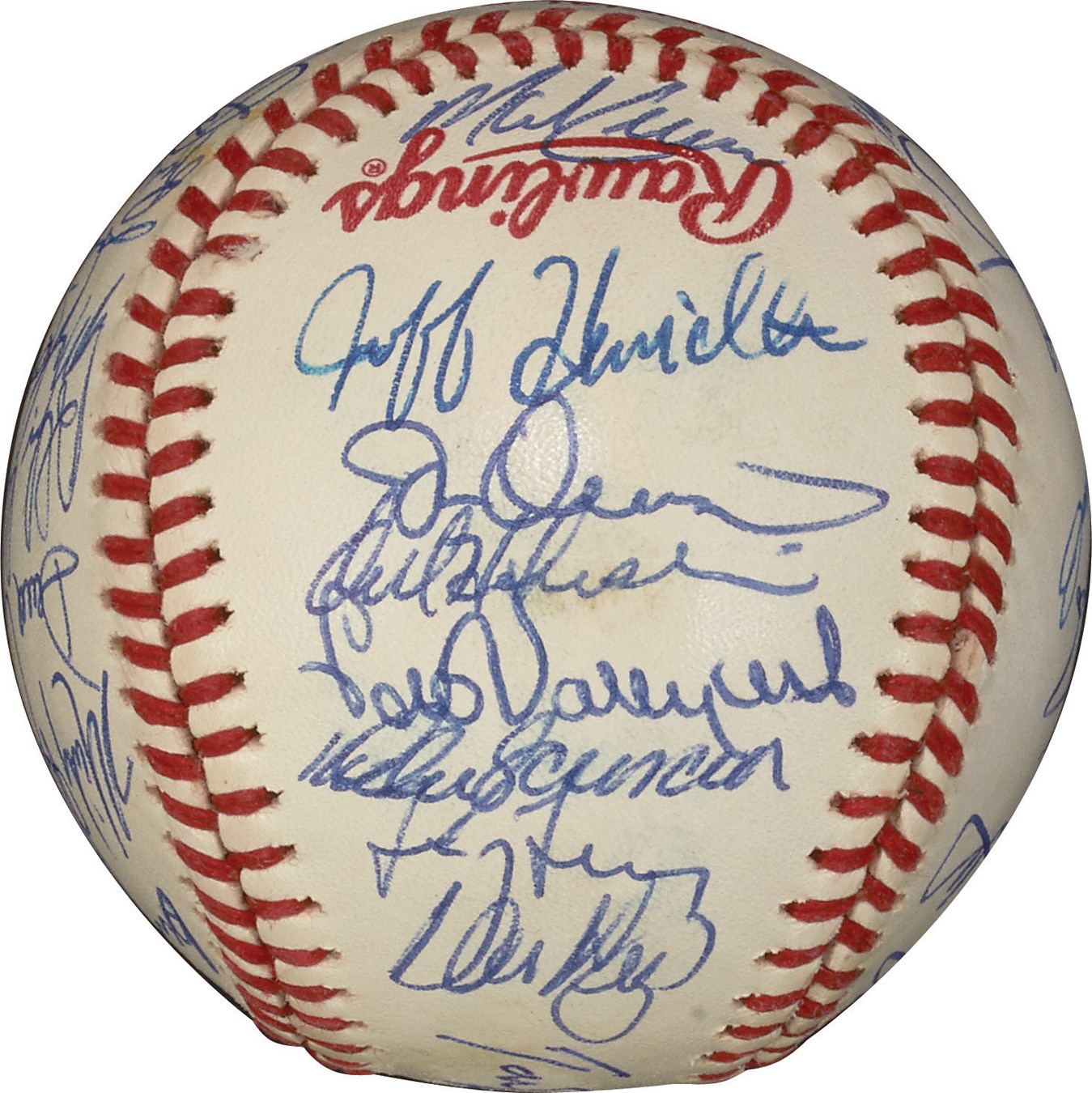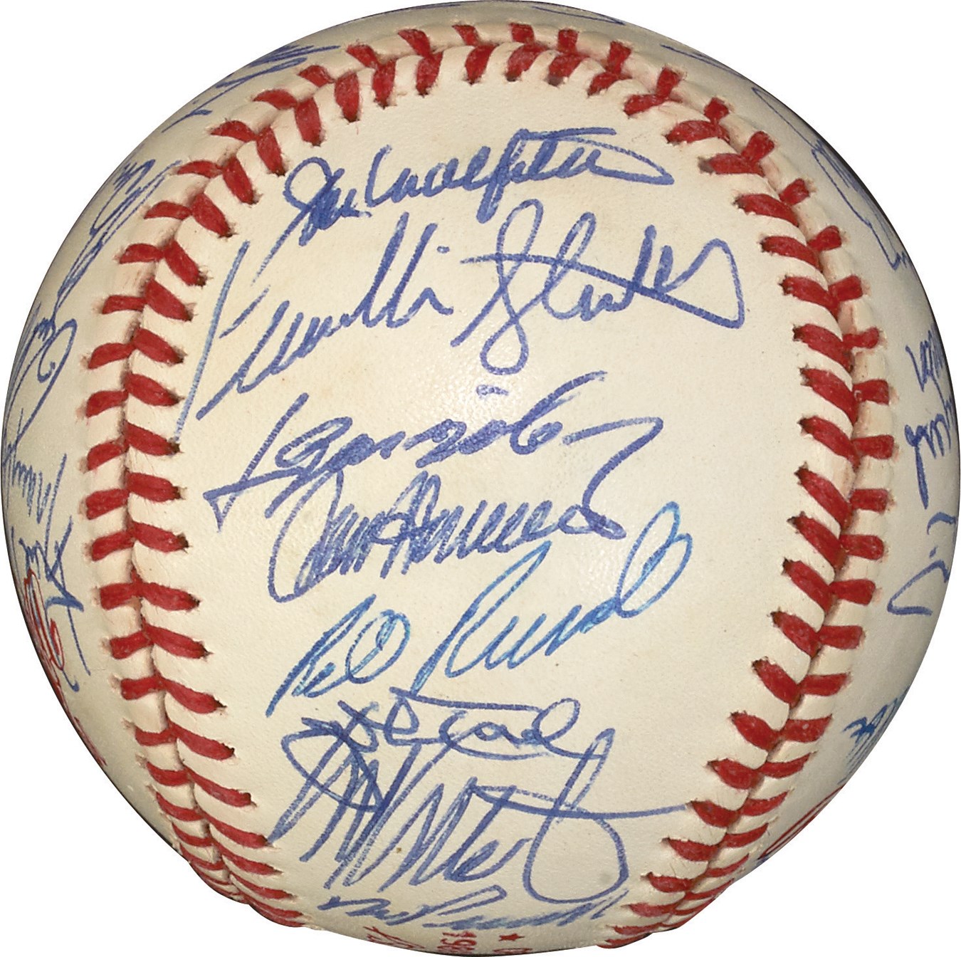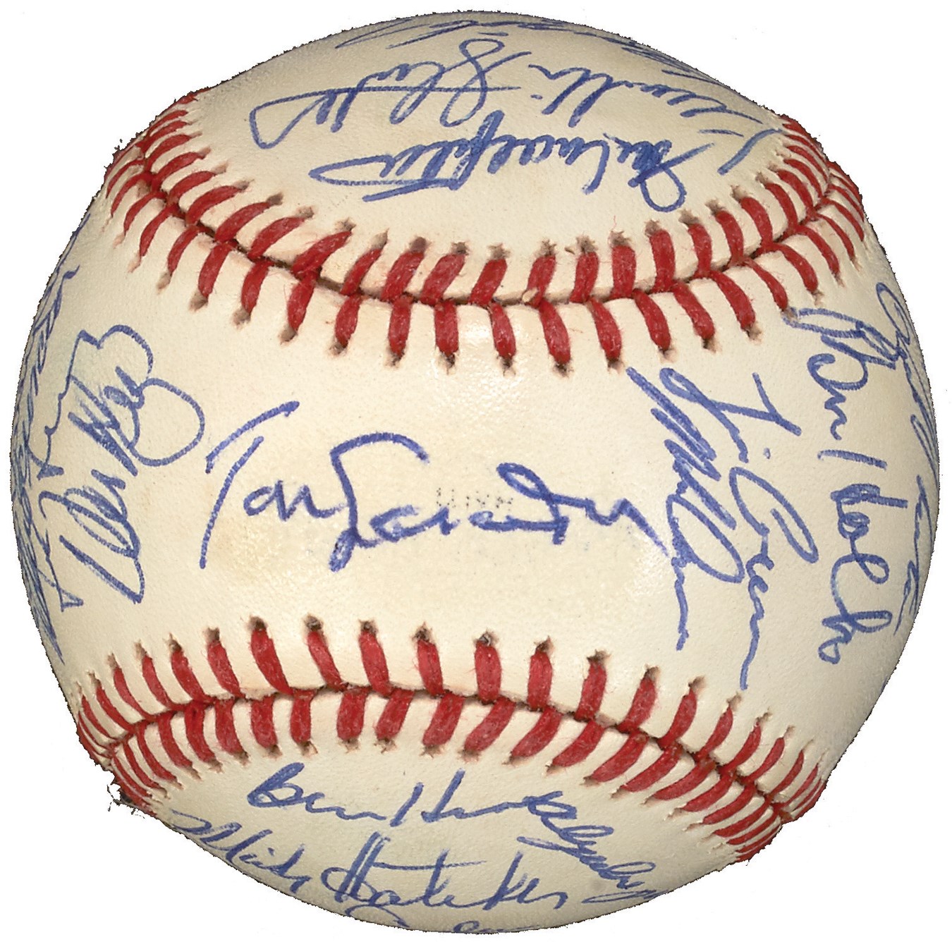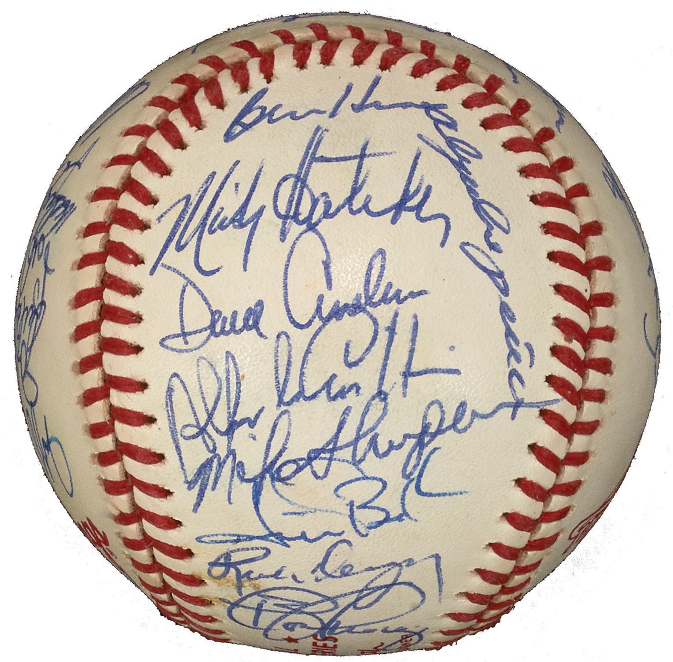 With Kirk Gibson providing the thunderbolt that sparked their success, the 1988 Los Angeles Dodgers stunned the favored Oakland A's to win the World Series after outlasting the powerful Mets in a seven-game NLCS. This Official 1988 World Series Baseball is NRMT to MINT and loaded with 32 signatures from the Dodgers roster. The signatures average 9/10 and are all in blue ballpoint pen. They include: Gibson, Crews, Lasorda, Hershiser, Valenzuela, Russell, Dempsey, Hatcher and more. This is a near-perfect signed baseball from a most memorable World Championship team.