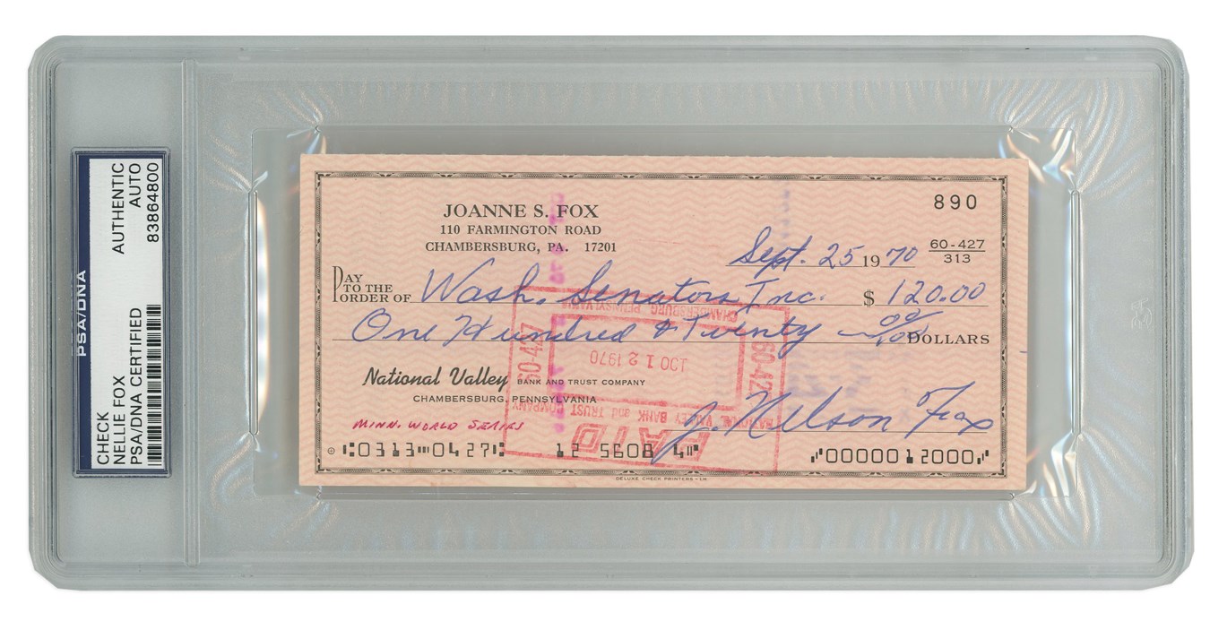 Lot # 317: 1970 Nellie Fox Signed and Encapsulated Check - PSA/DNA