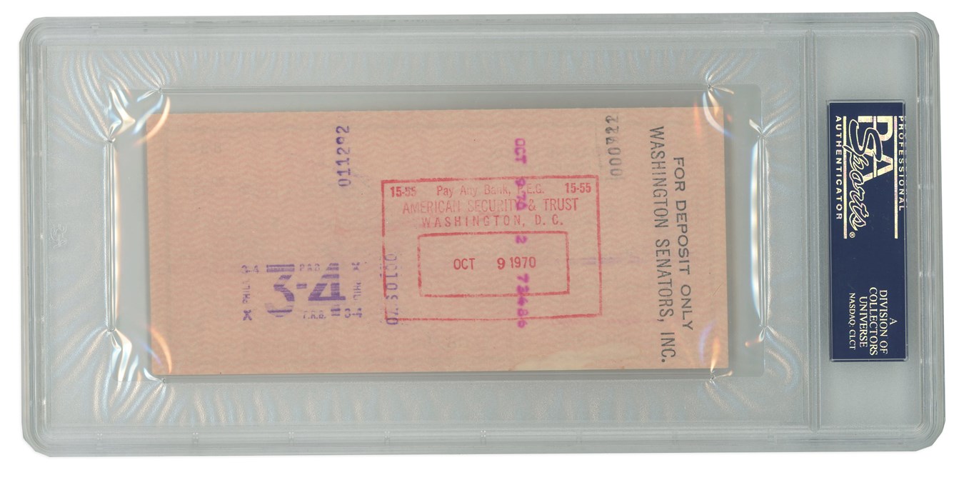 This encapsulated check bears the signature of Hall of Famer Nellie Fox. Drawn on the personal account of his wife, Joanne, it is signed in blue ballpoint ink as "J. Nelson Fox." and dated Sept. 25, 1970. Interestingly, it is made out to Wash. Senators Inc., for whom Fox was a coach at that time, with notation in red ink stating "MINN. WORLD SERIES" and the Senators' cancellation stamp is on back. Autograph is certified as Authentic by PSA/DNA.