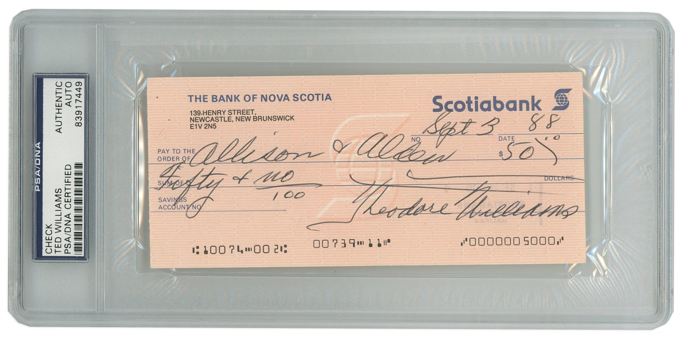 Lot # 326: Theodore Williams Signed and Encapsulated Check - PSA/DNA