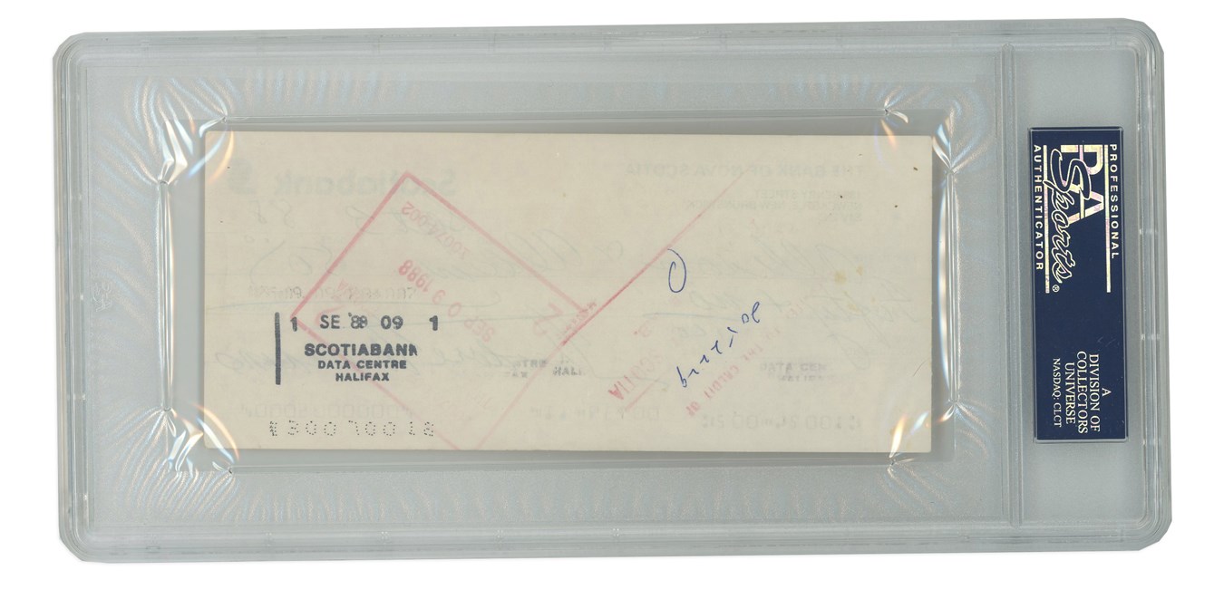 This canceled check bears the crisp autograph of slugging superstar Ted Williams. From the Bank of Nova Scotia and dated Sept 3, 1988, the black ink signature reads "Theodore Williams," and the check is encapsulated and autograph verified by PSA/DNA.