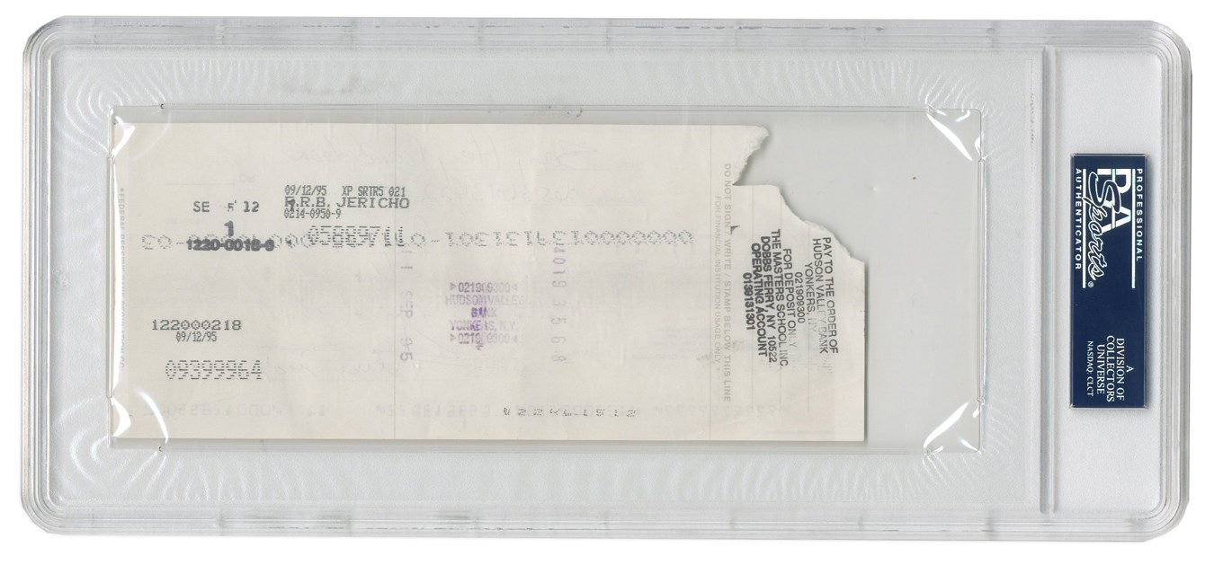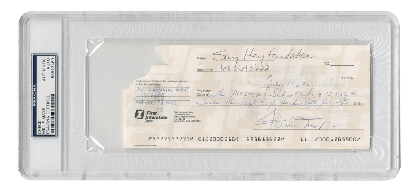 As much as Willie Mays is remembered for his baseball prowess, perhaps lesser known is the Hall of Famer's commitment to helping underprivileged kids. This encapsulated check is signed by Mays and dated July 15, 1995. It is drawn against the "Say Hey Foundation" - which exists to this day - in the substantial amount of $12,855, apparently to cover private school tuition for a student. The autograph in blue ballpoint ink is certified by PSA/DNA.